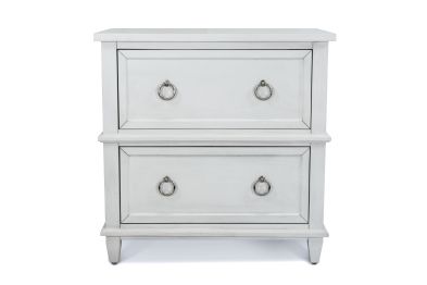 Brighten your bedside with this timeless poplar wood nightstand, finished in Fresh White with a Soft Grey Glaze for a clean, coastal-inspired look. Thoughtfully designed with two spacious drawers and an open shelf below, it offers a perfect mix of form and function. Pewter-finished ring and knob hardware adds a subtle shine, while ball-bearing glides ensure smooth, quiet operation. Felt-lined top drawers protect delicate items, and a hidden USB and power outlet on the back keeps your devices charged and close at hand—all crafted from SCS-certified wood.