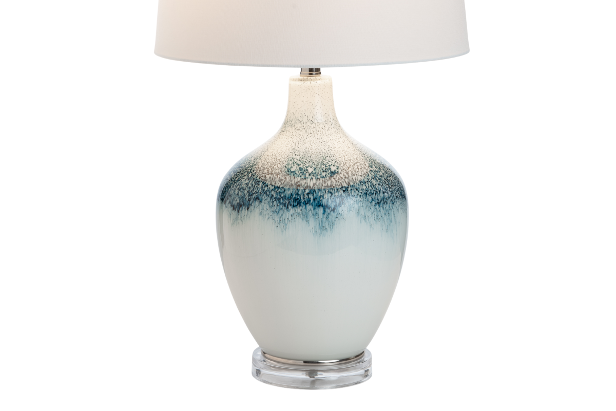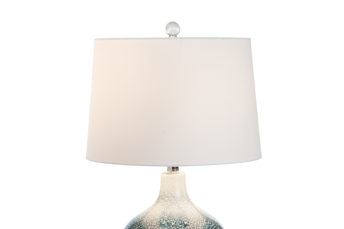 The lamp's base is a striking fusion of blue and white glass, reminiscent of the ocean meeting the shore. Standing at 28.5 inches tall, it gracefully commands attention while exuding coastal charm. The soothing color palette evokes images of beachside vacations, making it a perfect addition to coastal-themed interiors.