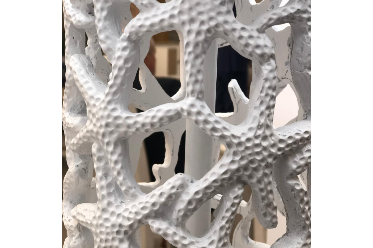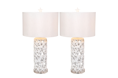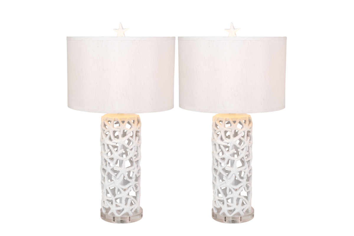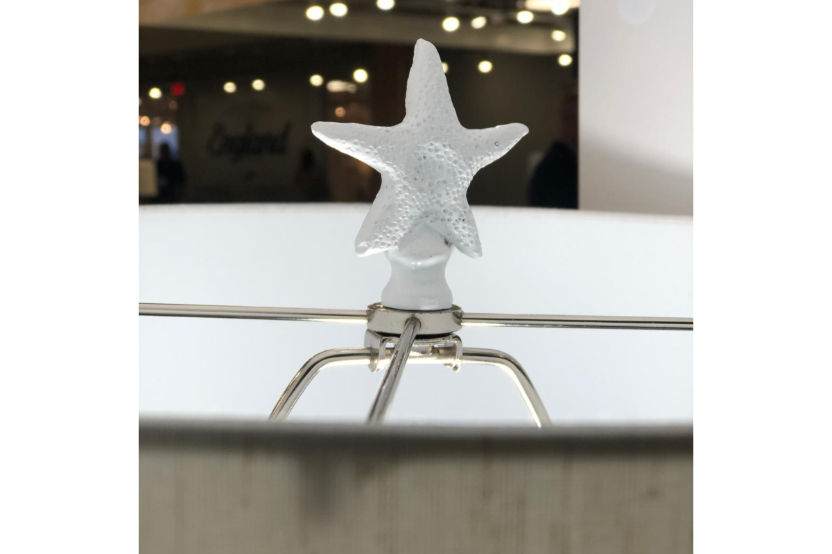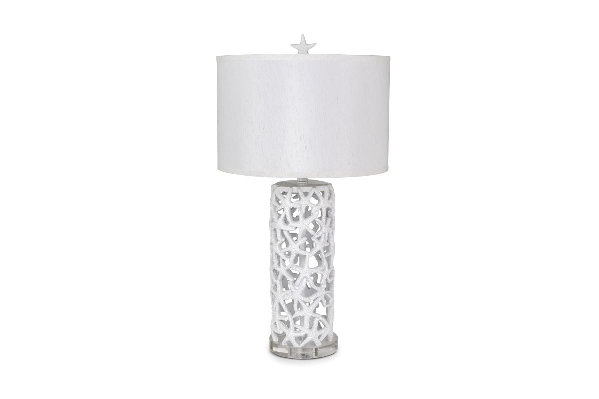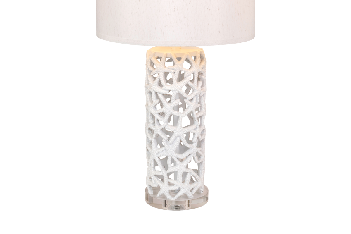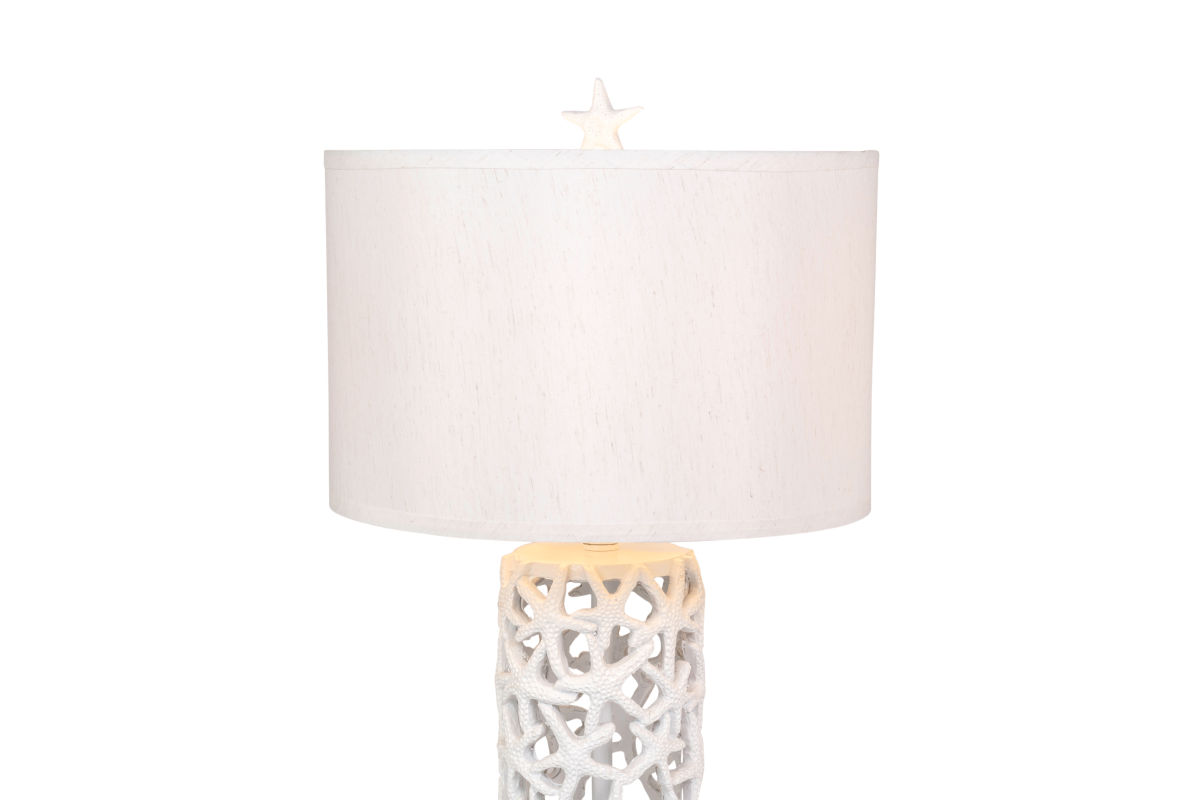 The lamp's base, meticulously crafted from pristine white poly material, is shaped like a star, reminiscent of seashore adventures and the beauty of the ocean. Standing at 30 inches in height, it gracefully commands attention while maintaining a versatile presence, making it an enchanting focal point adaptable to various decor styles. Topped with a linen hardback shade, this lamp captures the essence of coastal elegance with its clean lines and neutral tones. The shade diffuses the light softly, creating a warm and inviting ambiance akin to a tranquil beachfront getaway while accentuating the lamp's overall coastal feel.
