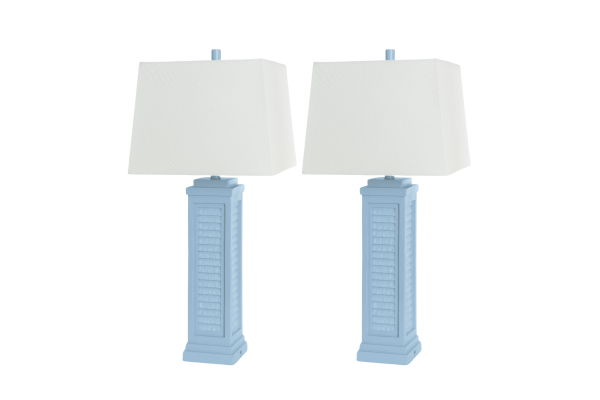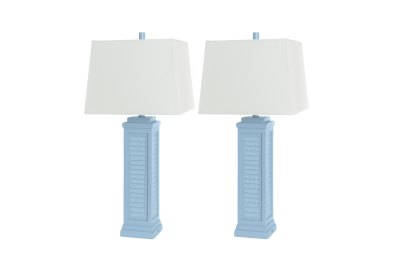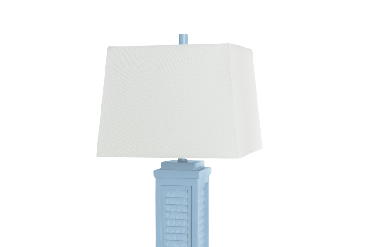 The lamp's base, meticulously crafted from durable poly resin, features intricate shutter detailing reminiscent of seaside cottages. Standing tall at 32 inches, it captures the essence of coastal charm while maintaining a versatile presence that complements various decor styles. The soft coastal color palette adds a touch of serenity and visual interest to the lamp, making it a captivating addition to any room.