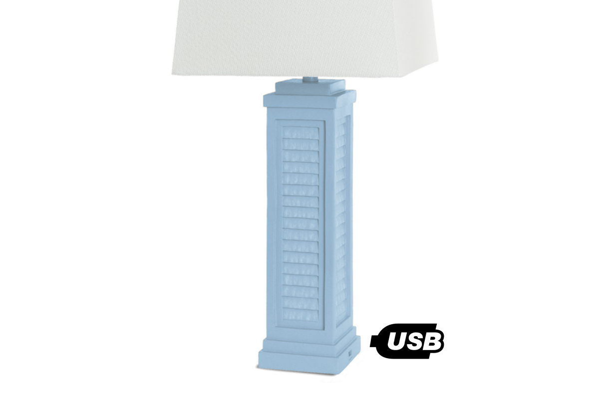 The 32-Inch Poly Resin Shutter Coastal Table Lamp with USB is more than just a lighting fixture; it's a piece of coastal paradise that infuses the serenity and allure of the sea into your home. Place it in your beach house, seaside retreat, or any space where you want to create a coastal oasis. Illuminate your surroundings with the soothing, beachy charm of this exceptional lamp. Some assembly required.