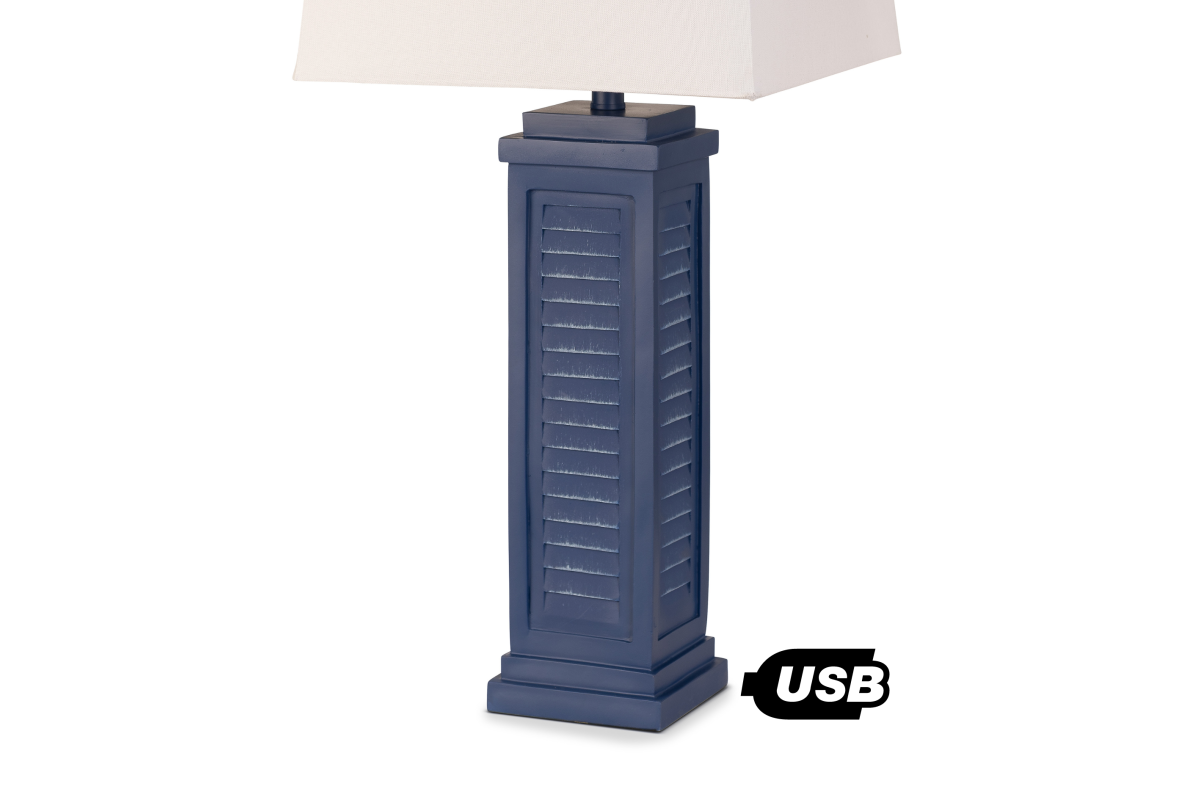 The 32-Inch Navy Blue Poly Resin Shutter Coastal Table Lamp with USB is more than just a lighting fixture; it's a piece of coastal paradise that infuses the serenity and allure of the sea into your home. Place it in your beach house, seaside retreat, or any space where you want to create a coastal oasis. Illuminate your surroundings with the soothing, beachy charm of this exceptional lamp. Some assembly required.