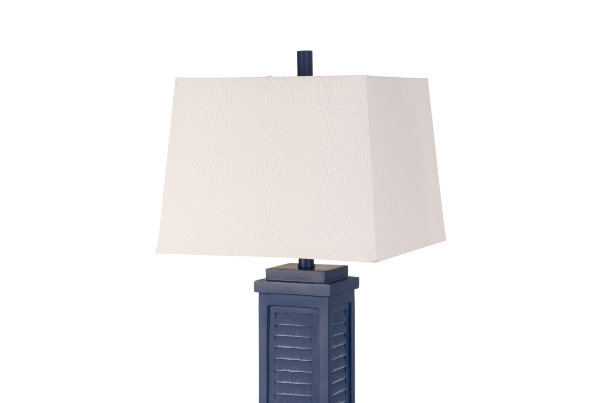 The lamp's base, meticulously crafted from durable poly resin, features intricate shutter detailing reminiscent of seaside cottages, all bathed in a rich navy blue hue. Standing tall at 32 inches, it captures the essence of coastal charm while maintaining a versatile presence that complements various decor styles. The deep navy blue finish adds a touch of sophistication and visual interest to the lamp, making it a captivating addition to any room.