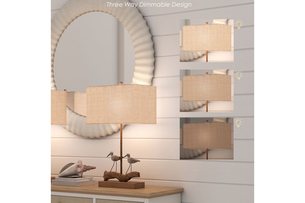 Topping off this coastal masterpiece is a linen hardback shade that complements the lamp's natural appeal with clean lines and neutral tones. The shade not only diffuses the light softly, creating a warm and inviting ambiance reminiscent of a peaceful day in nature but also enhances the lamp's overall aesthetic.