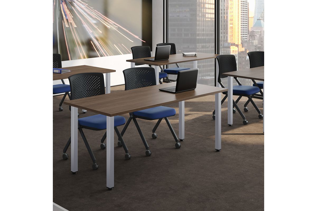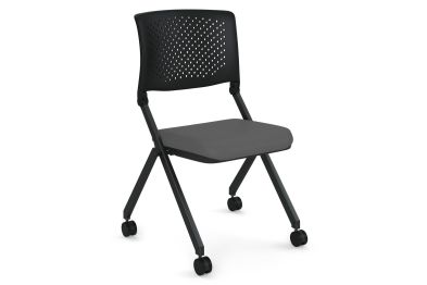 The Nesting Chair with Casters features chairs with durable black frames and fabric seats. The seats come in a variety of upholstery colors. Assembly is required.