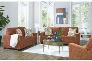 Looking to make a bold statement with color? Liven up your living room with this loveseat. Its trend-right burnt orange upholstery adds a playful pop of color to your decor. Bold and eclectic accent pillows complete the look. Pairing posh style with everyday comfort, this piece is a welcome addition to contemporary spaces.