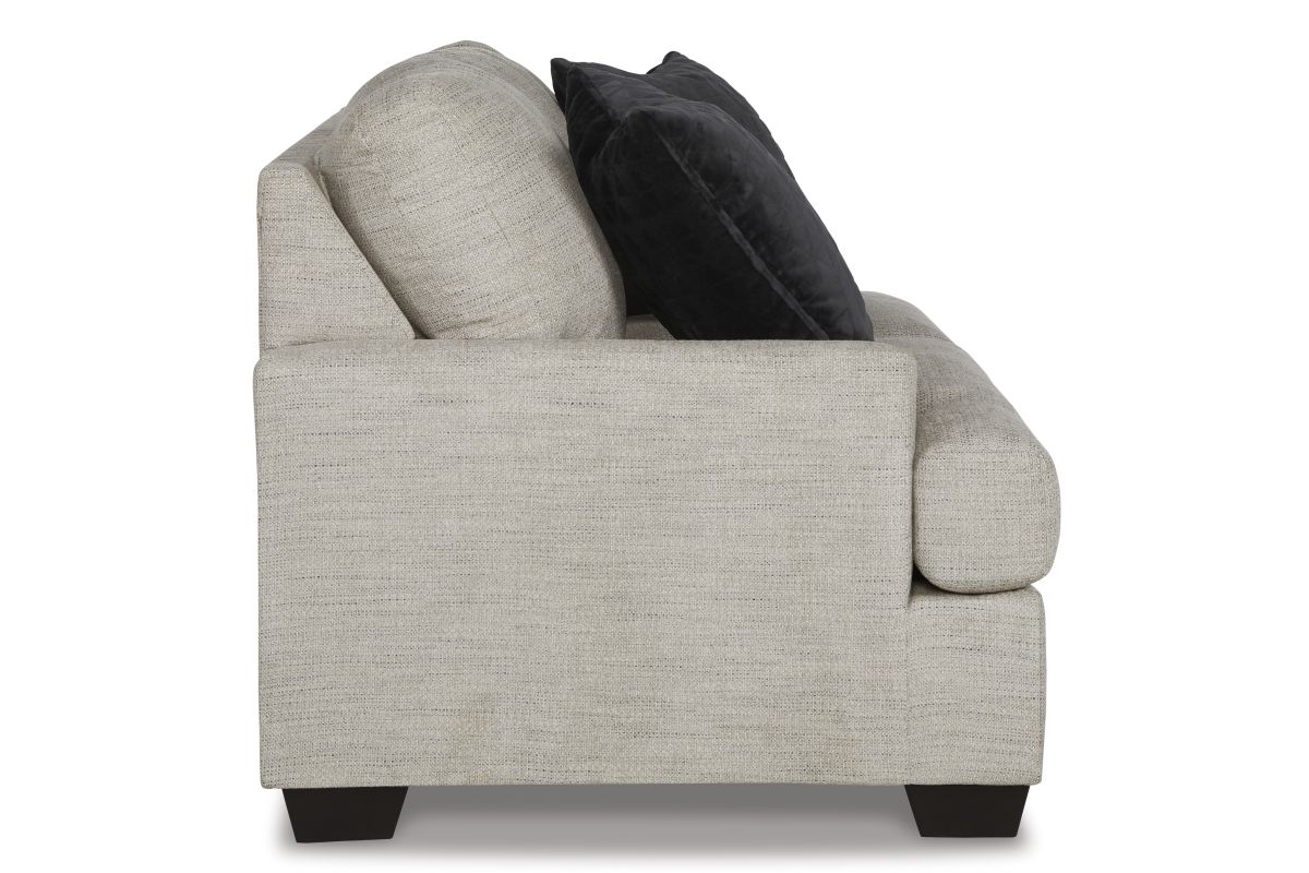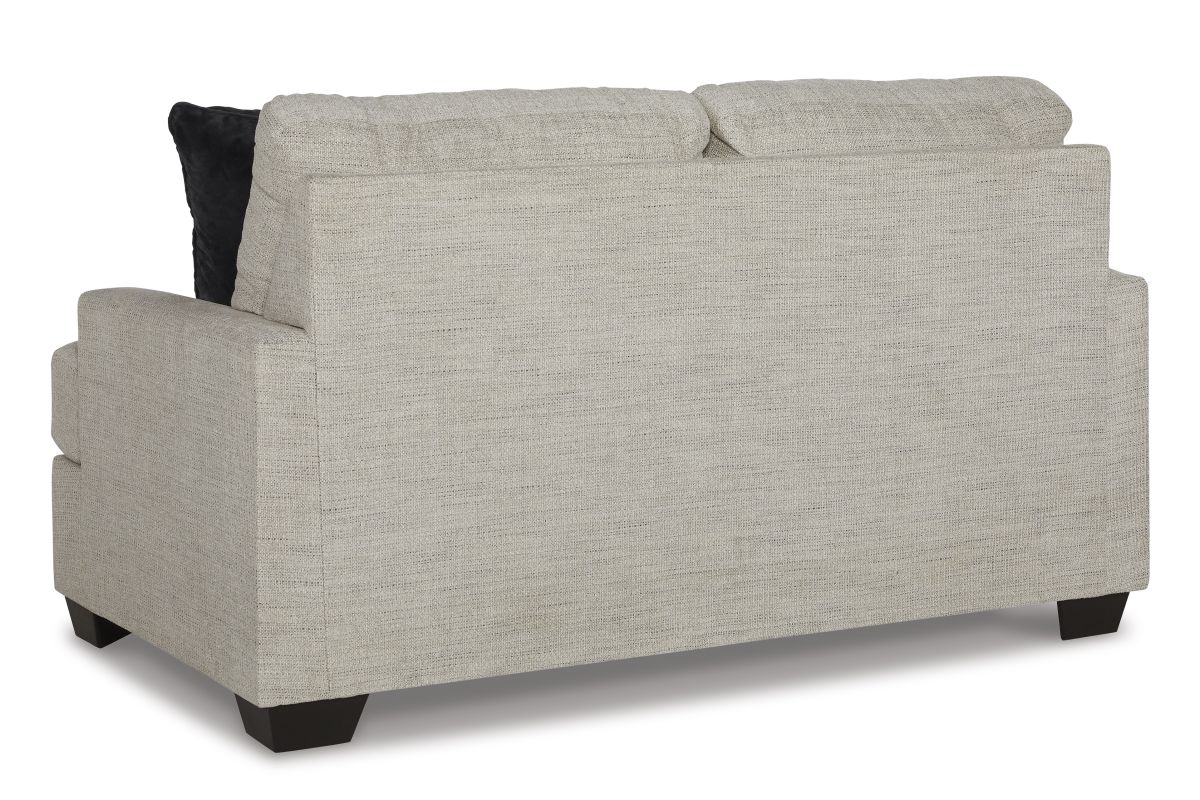 Laid-back luxury meets neutral practicality in this loveseat. Taking its cues from contemporary design, the clean-lined piece is outfitted with angular arms for a layer of geometric expression. Softly upholstered, sizable cushions keep you comfortable, while black faux fur accent pillows bring a touch of soft glam. With this loveseat, winning style and superb functionality go hand in hand.