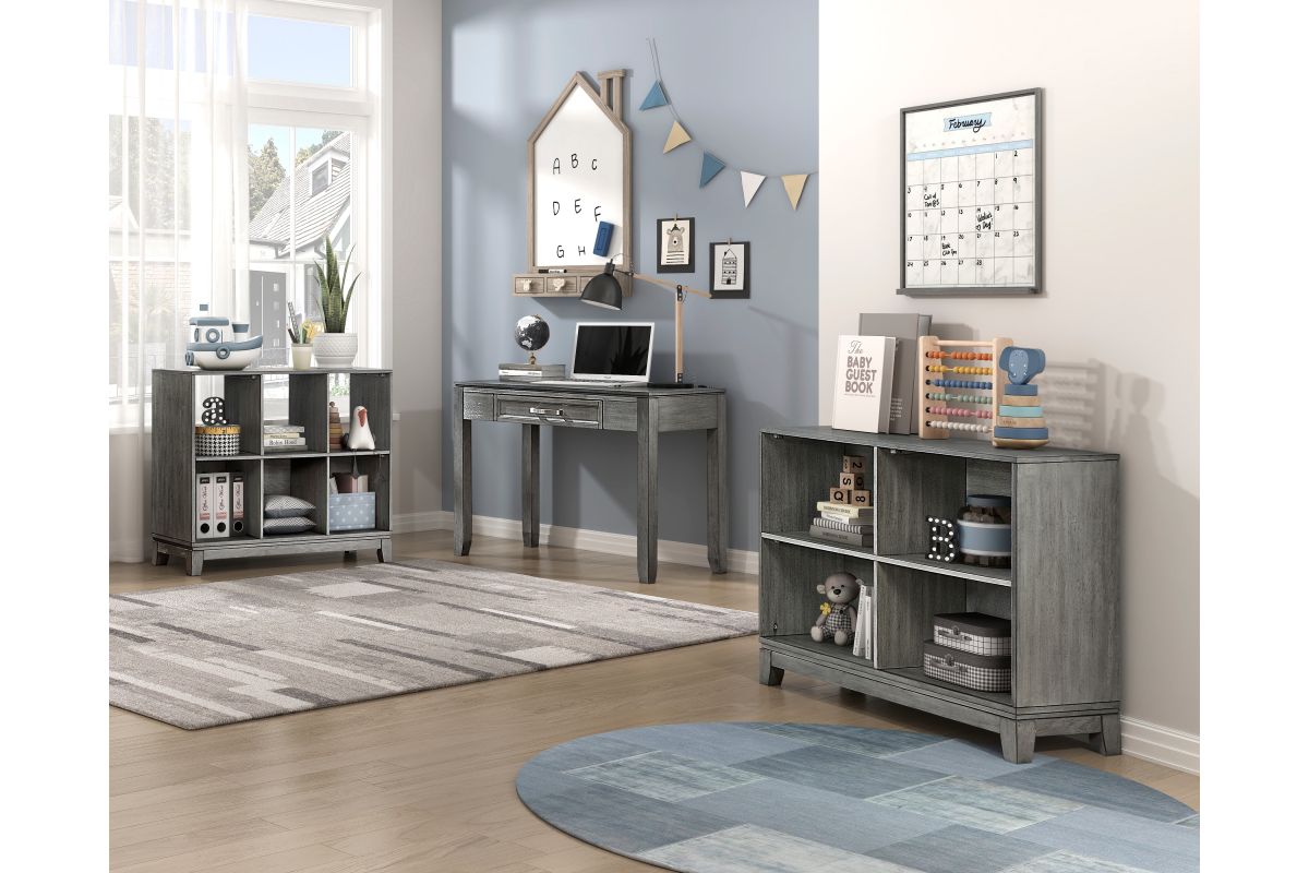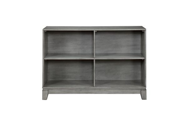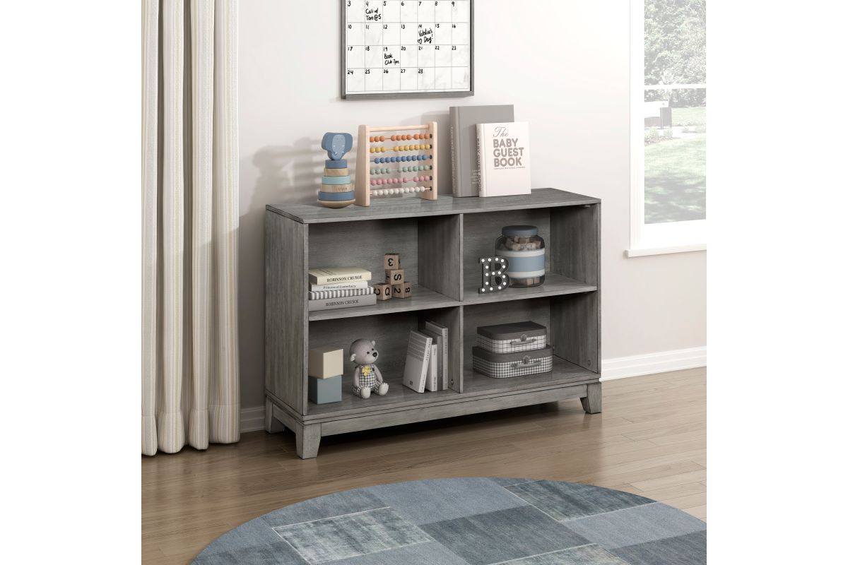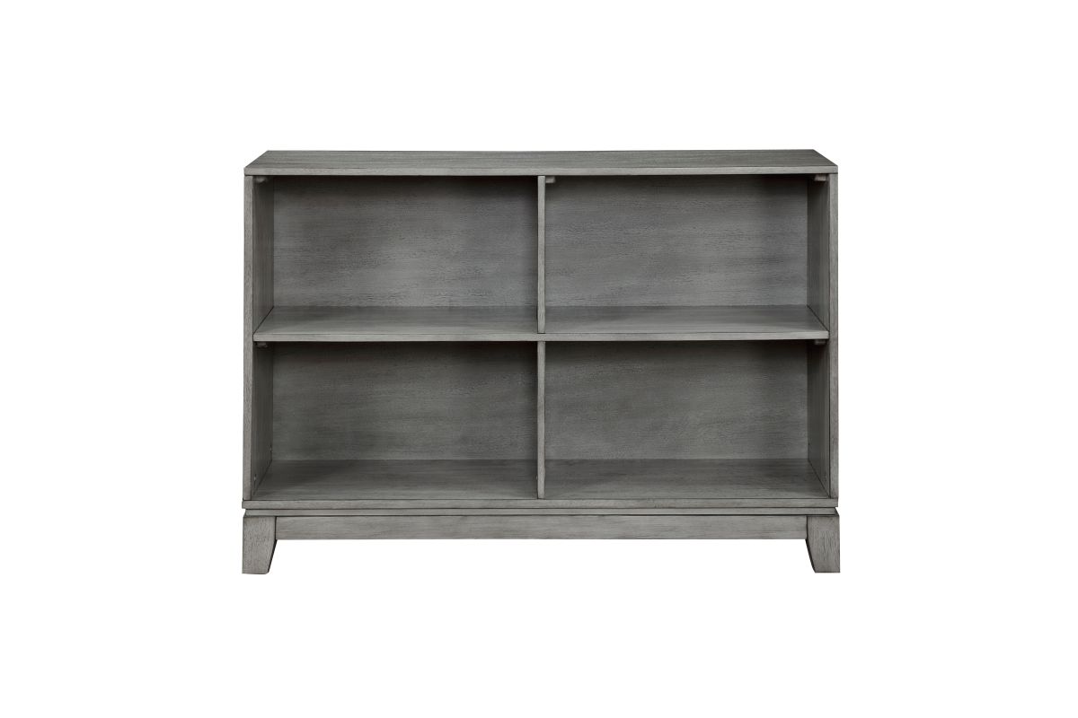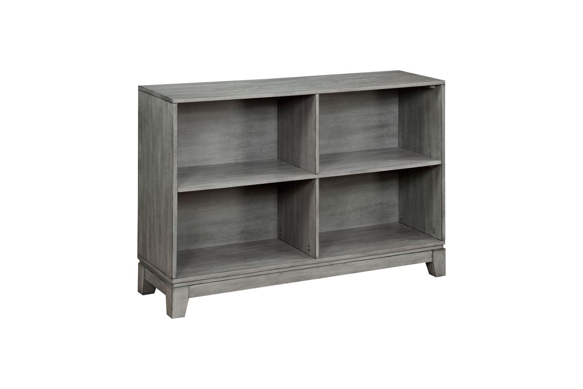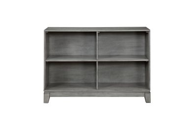 The Garretson Collection blends transitional lines with rustic styling to create an elegant addition for your bedroom. The okume veneer of the 4-shelf bookcase features a gray finish. Assembly required.