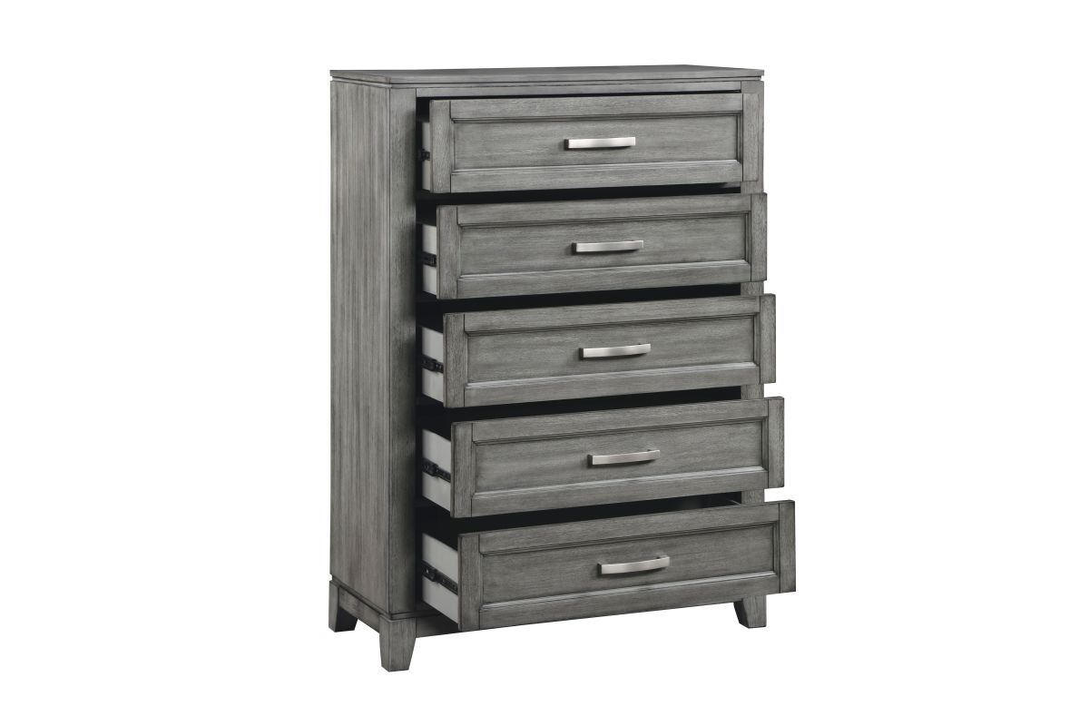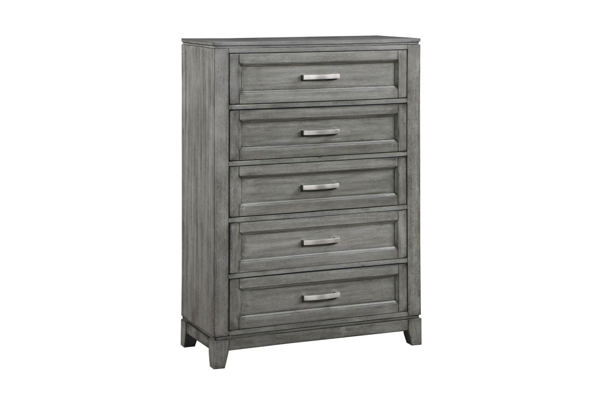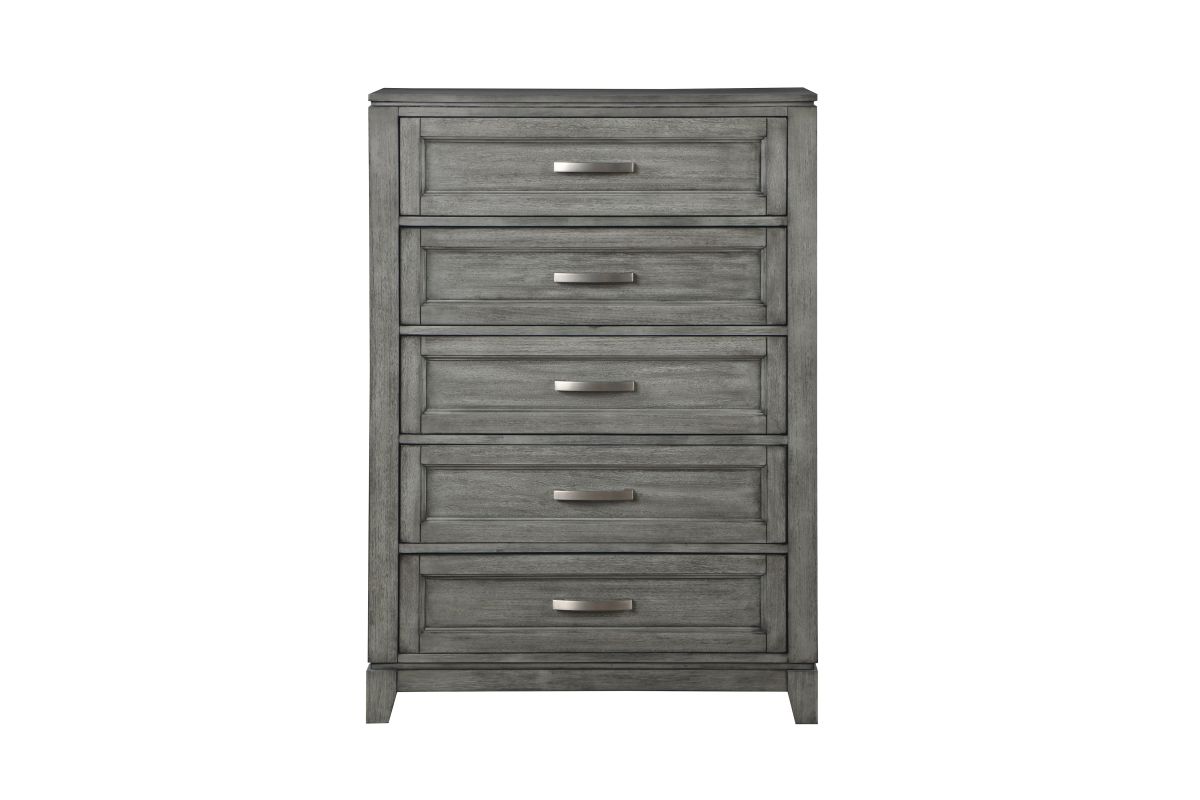 The Garretson Collection blends transitional lines with rustic styling to create an elegant addition for your bedroom. The distinct grain of the okume veneer features a gray finish. Metal bar hardware accents the picture frame drawer fronts of the chest. Assembly required.