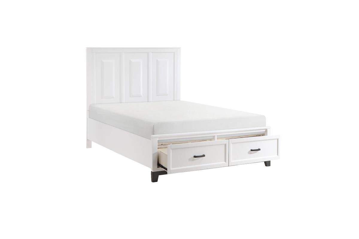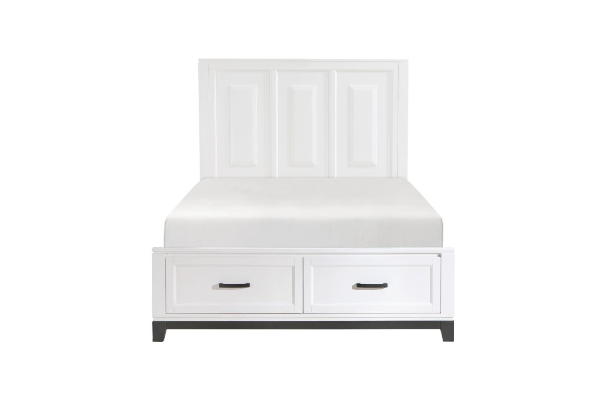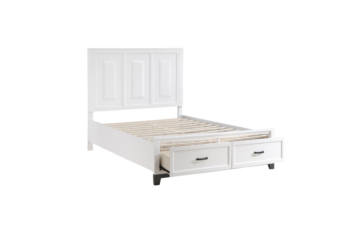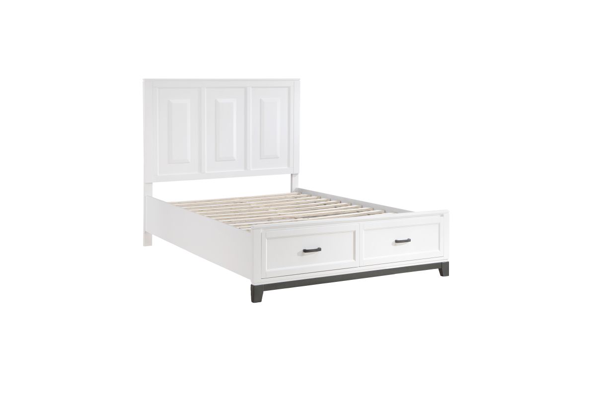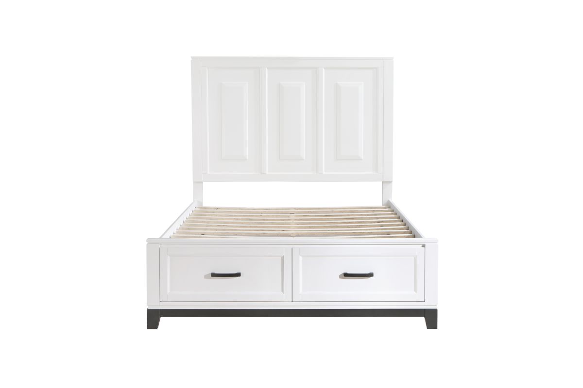 The Garretson Collection blends transitional lines with rustic styling to create an elegant addition for your bedroom. The queen bed features a white finish and metal bar hardware on the picture frame drawer fronts of the low-profile storage footboard, the two drawers creating additional space within your room for soft good storage. Assembly required.