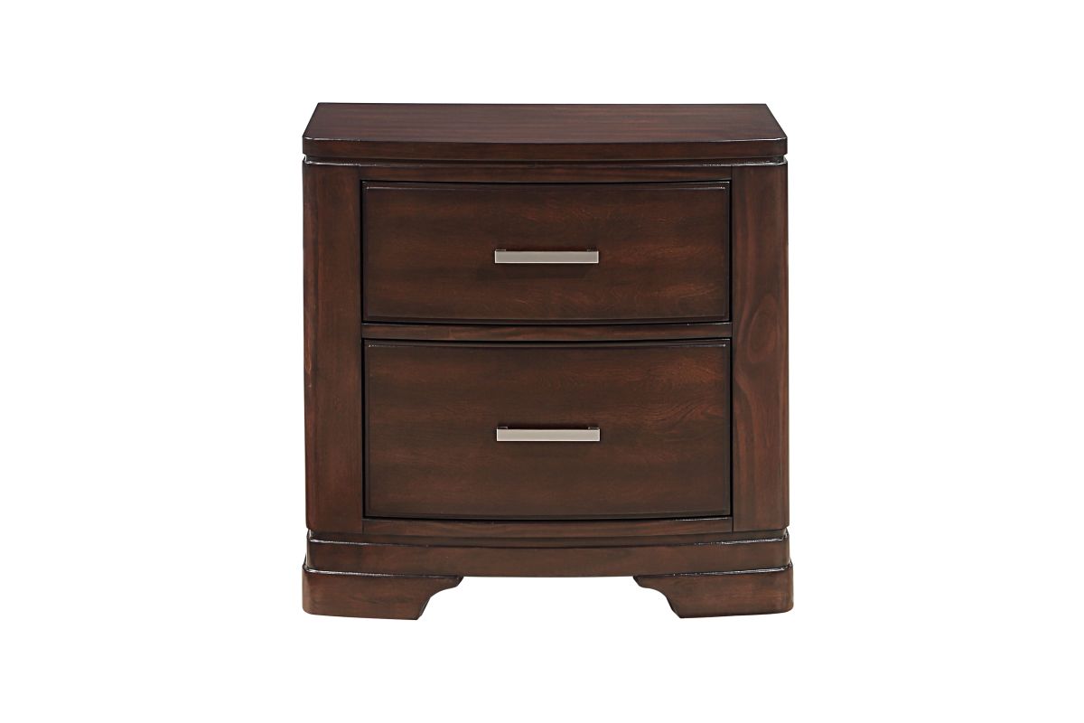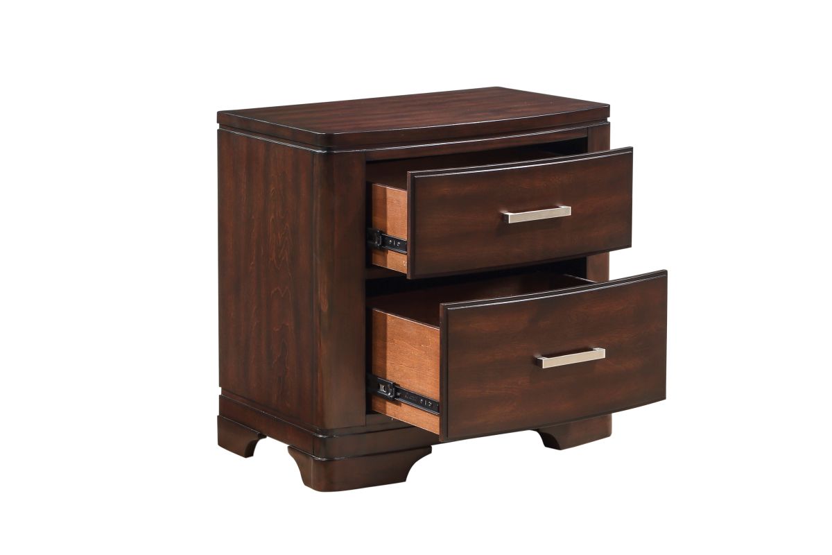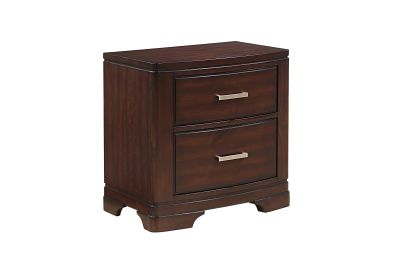 The intersection of modern lines and understated transitional style blend to create the Hudson Collection. The cherry finish over birch veneer, of the nightstand presents a decoratively versatile addition to your bedroom. Polished chrome bar hardware fronts the drawers of the nightstand. Assembly required.