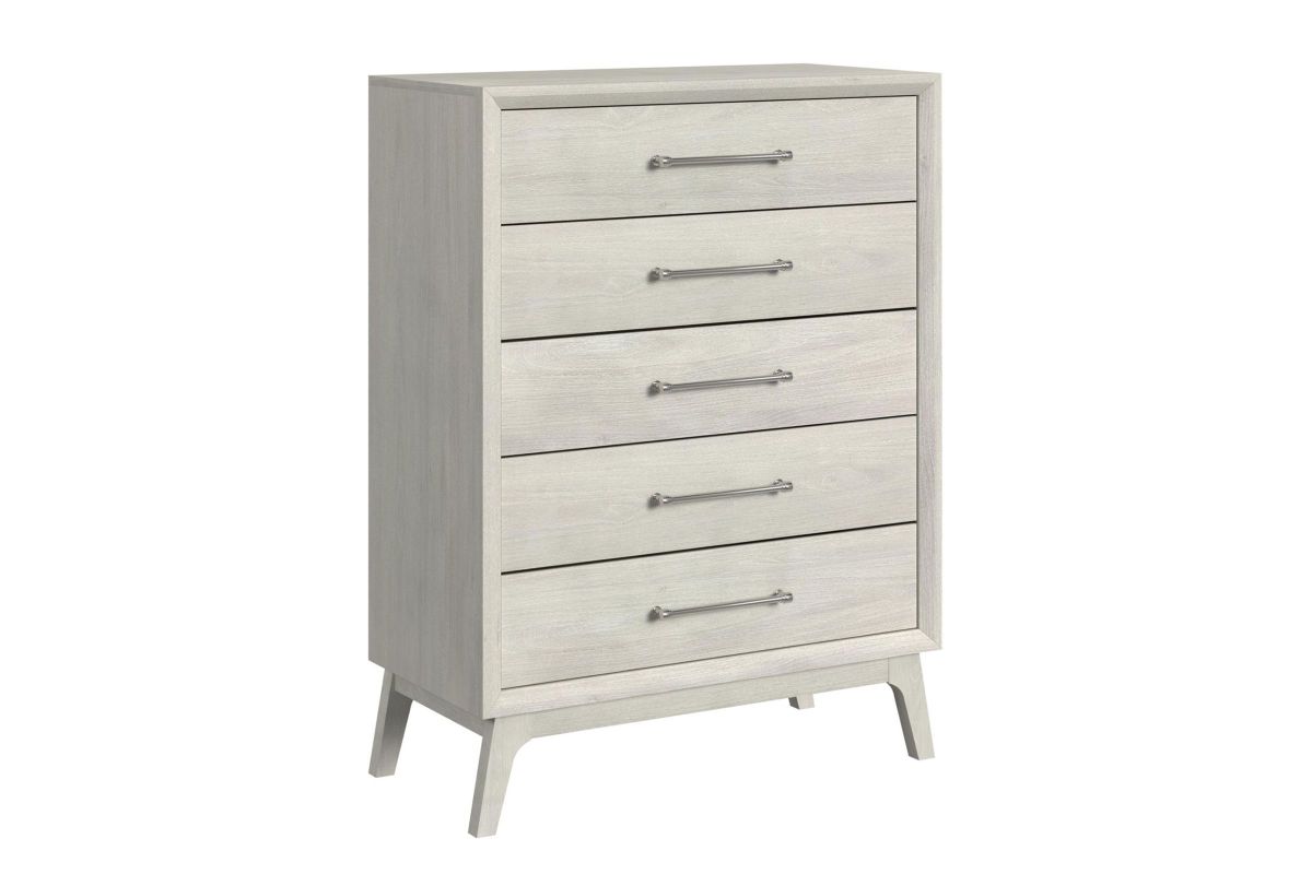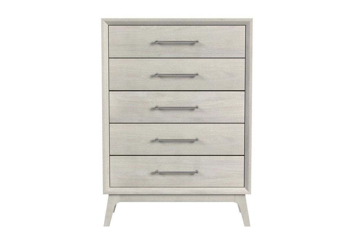 The Sydney Chest is a stylish and functional addition to your bedroom. Featuring a sleek almond finish, this piece offers a modern twist on a classic design, bringing a fresh, contemporary look to any space. The chest is equipped with five spacious drawers, providing ample storage for your belongings. Its satin nickel hardware complements the warm almond color, creating a sophisticated contrast. The chest stands on gracefully tapered legs, adding to its refined appearance and ensuring durability. This versatile piece will effortlessly enhance the organization and style of your bedroom.