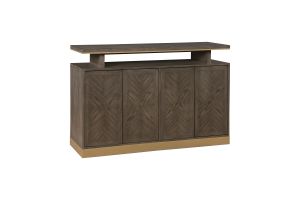 Curating a space that reflects your love for modern lines and desire for a sophisticated aesthetic becomes reality with the addition of the Griffin Collection. A brown finish highlights the sunburst oak veneer pattern, its rich hue complemented by the gold finish metal banding that graces the table’s apron and trestle base, chair legs, and server’s floating top and base. Expanding the table’s seating capacity is the self-storing table leaf. Assembly required.