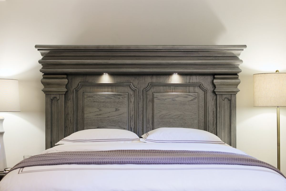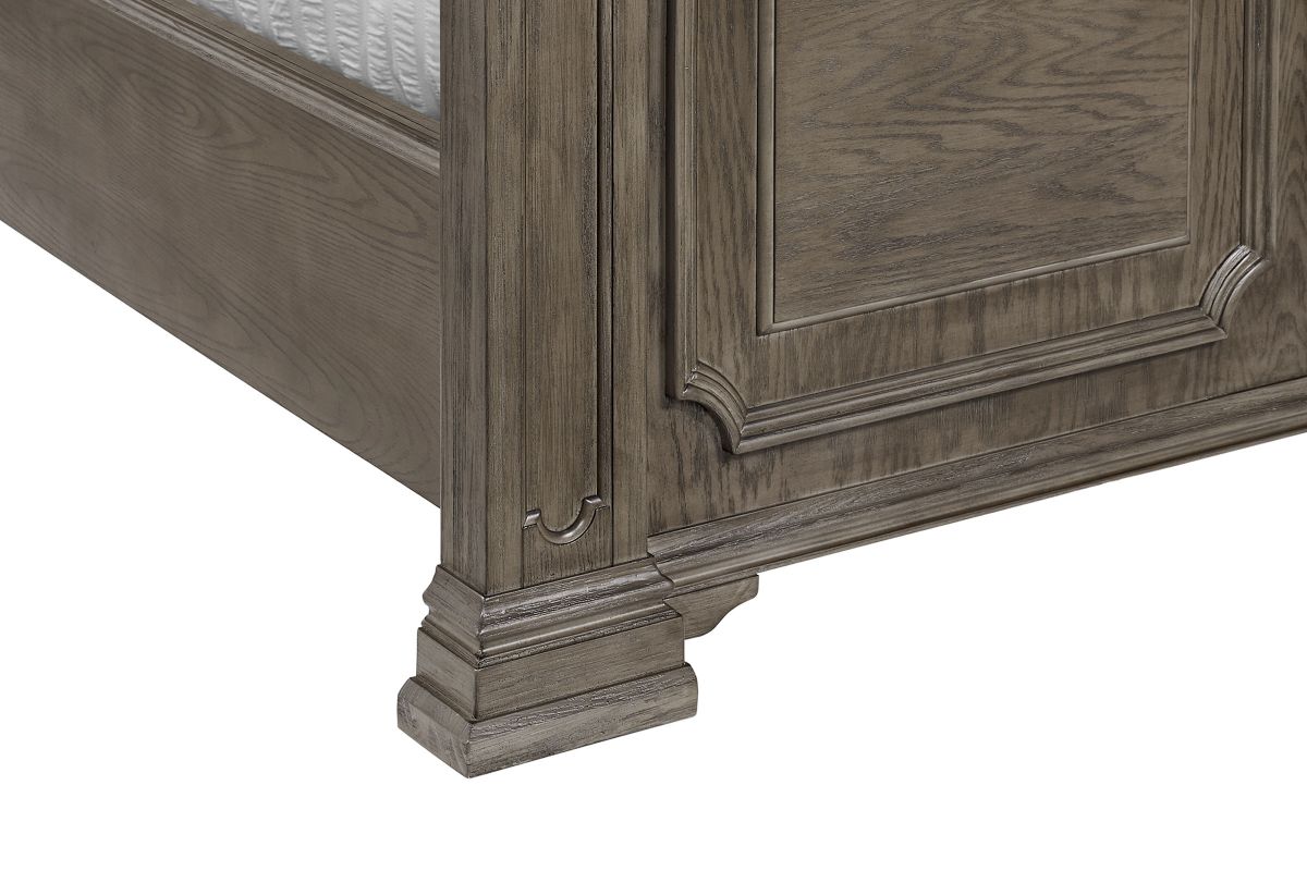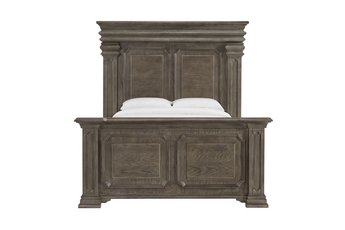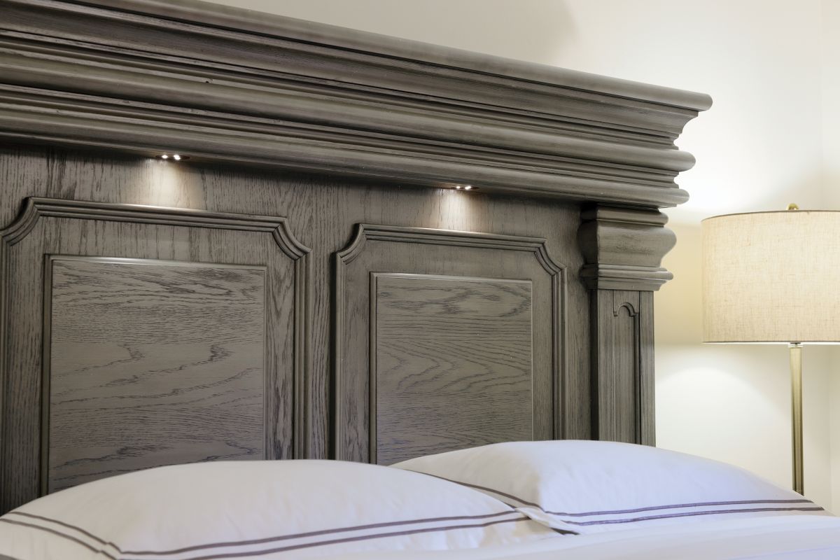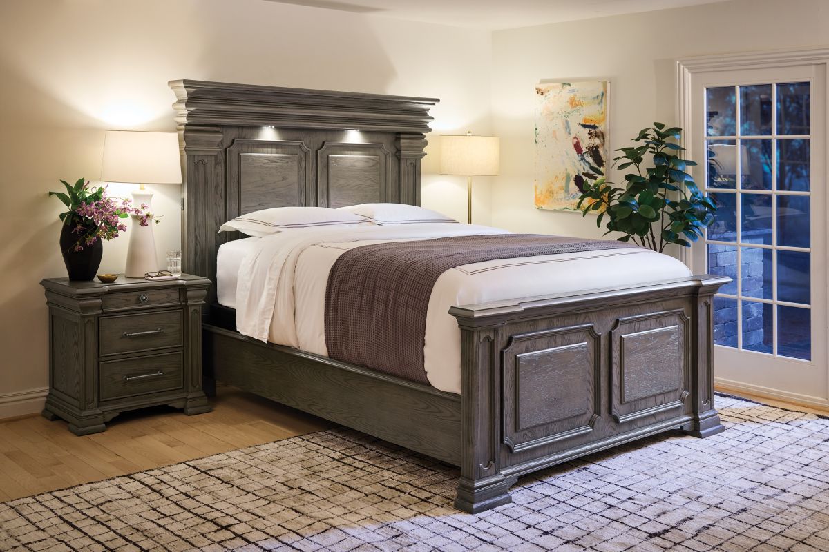 The Radcliff Queen Pabel Bed has high-minded style and a homey touch. Its dual panel headboard and footboard feature an inlay design and warm touch lighting. The subtle gray finish,