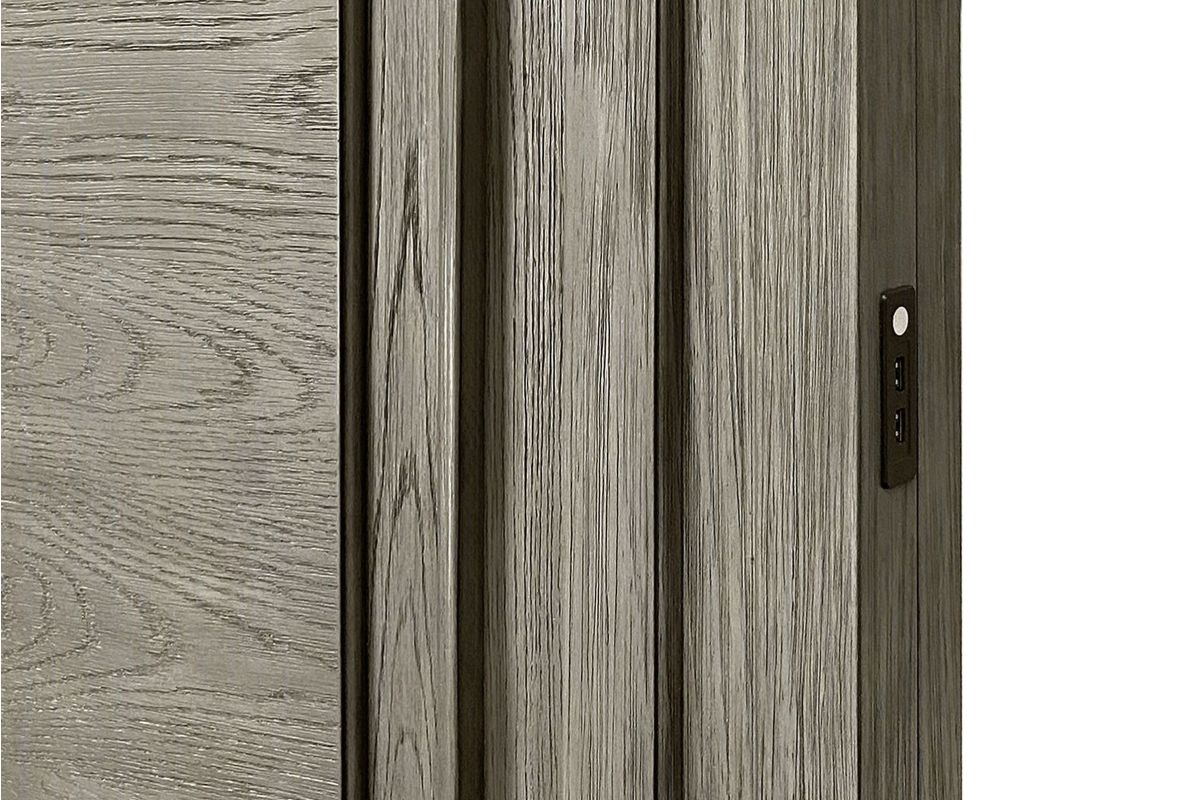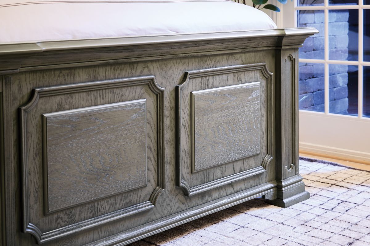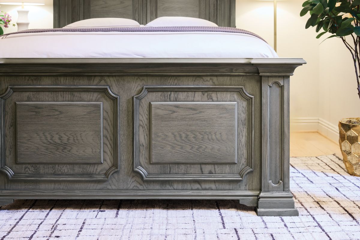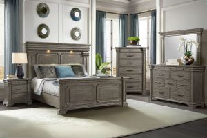 The Radcliff King Pabel Bed has high-minded style and a homey touch. Its dual panel headboard and footboard feature an inlay design and warm touch lighting. The subtle gray finish,