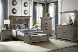Transform your bedroom into a sophisticated sanctuary with the Radcliff Storage Bedroom Set. This set features refined molding, giving it an elegant and timeless look. The high headboard adds a touch of grandeur to your space, while the touch-button mood-lighting in the headboard creates a relaxing ambiance. With two USB ports conveniently located in the headboard, you can easily charge your devices while lounging in bed. The black felt lined top drawers of all the case pieces provide a luxurious touch, and the nightstand sliding top with hidden storage offers safe keeping of your valuables. Finished with cedar veneer bottom drawers, this set combines style and durability for long-lasting use.