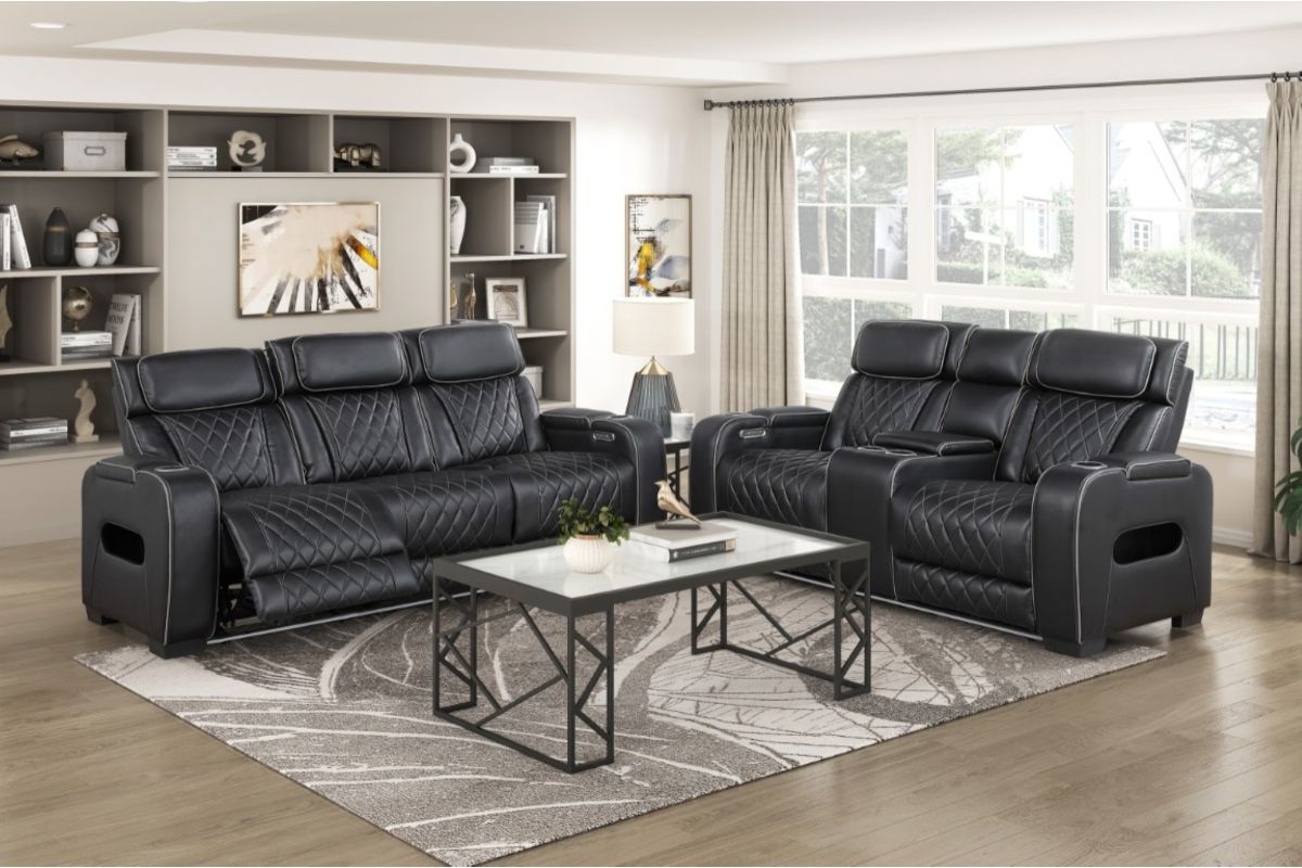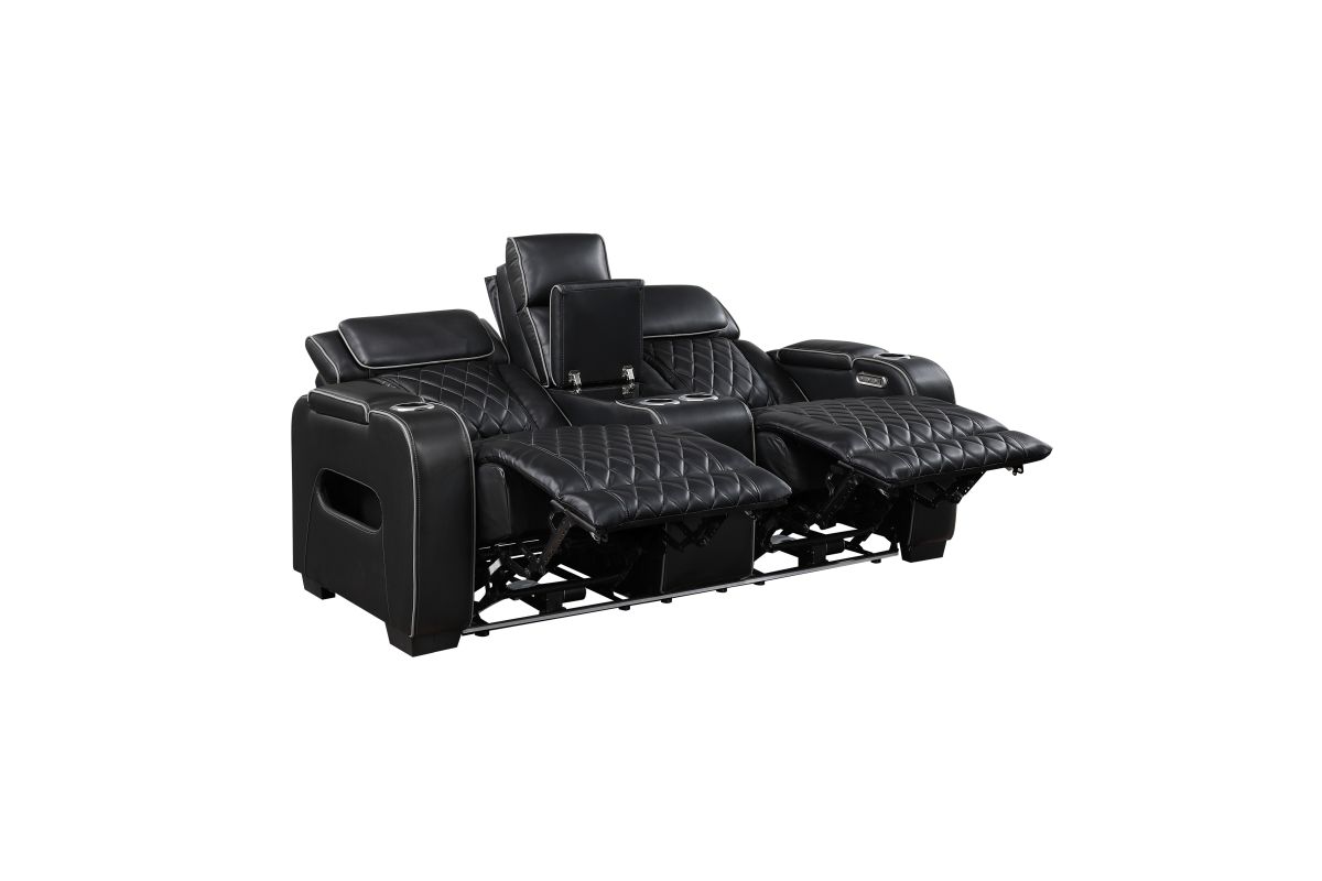 Experience unparalleled comfort and convenience with this black faux leather power double reclining loveseat. This luxurious loveseat is designed for ultimate relaxation with features like independent power reclining, adjustable power headrests, and ambient LED lighting. The center console provides storage and cup holders for added convenience, while built-in USB ports keep your devices charged. Top and side storage arms offer additional storage space for remotes or other essentials. The sleek black faux leather upholstery with diamond-stitched detailing adds a touch of modern sophistication, making this loveseat a perfect centerpiece for your home theater or living room. assembly required.