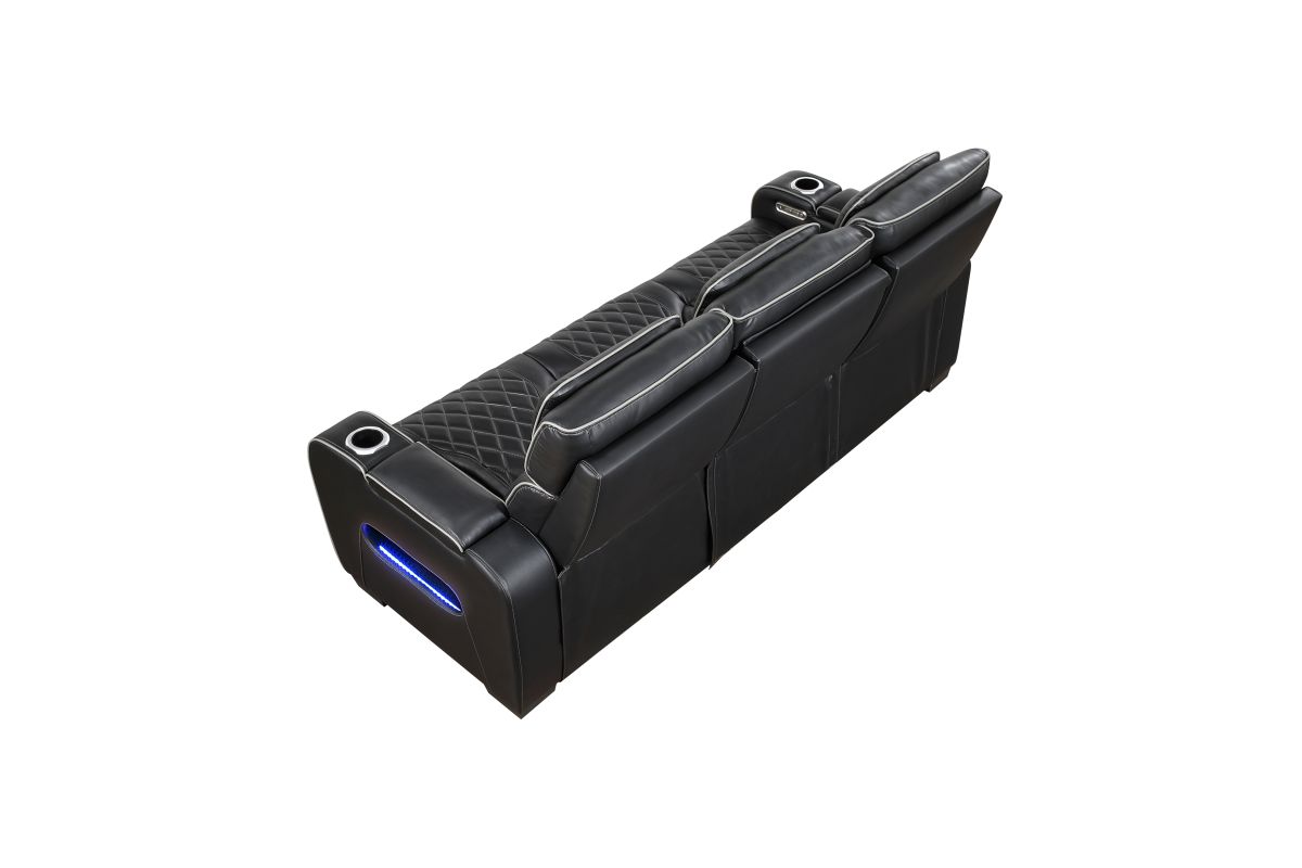 Experience the pinnacle of home theater luxury with this black faux leather power double reclining sofa. Designed for ultimate comfort and convenience, this sofa features independent power reclining and adjustable power headrests, allowing each person to find their perfect position. The center drop-down console reveals cup holders and reading lights, while two wireless charging pads and USB ports keep your devices powered. Top and side storage arms provide ample space for remotes and other essentials. Ambient LED lighting adds a touch of modern sophistication. The sleek black faux leather upholstery with diamond-stitched detailing ensures both durability and style, making this sofa the perfect centerpiece for your entertainment space.