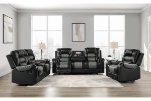 Experience ultimate comfort and convenience with the Hart Reclining Sofa (Model SH8890BLK-3). Featuring power reclining seats, a central drop-down table with integrated charging station, and built-in cup holders, this sofa is designed to enhance your living room with style and functionality. Upholstered in sleek black fabric, it offers both durability and modern appeal.