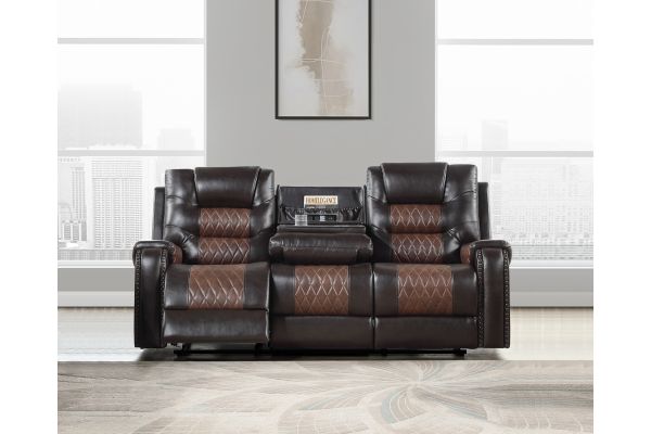 Enjoy ultimate comfort and convenience with the Hart Reclining Sofa (Model SH8890BRW-3). Featuring power reclining seats, a central drop-down table with integrated charging station, and built-in cup holders, this sofa combines functionality with cozy style. Upholstered in warm brown fabric, it's perfect for family rooms, media centers, or any relaxing space.