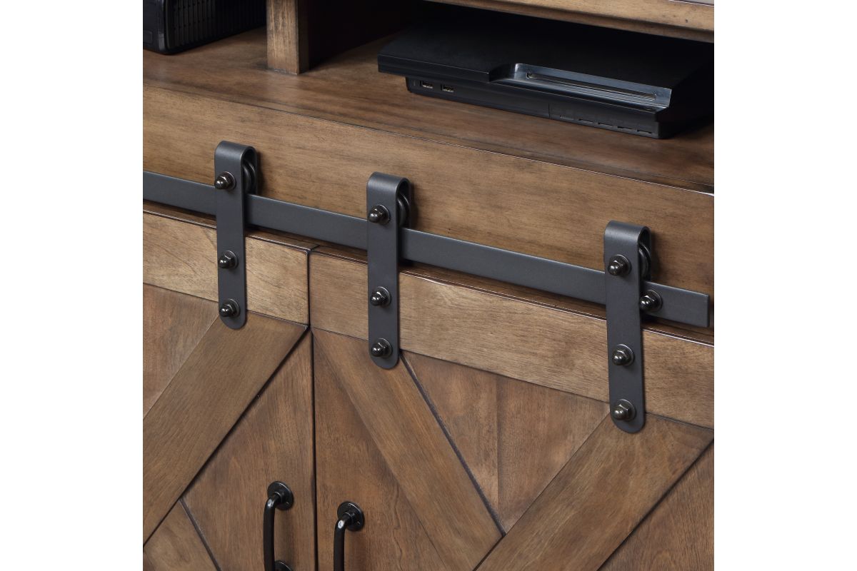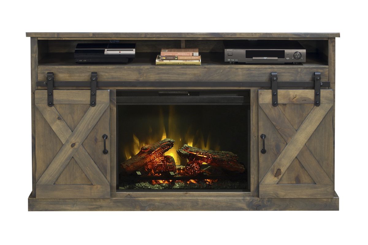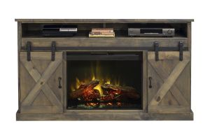 The Bridgevine Home Rustic Farmhouse 66" Electric Fireplace TV Stand Console is steeped in age-old tradition and style. Expertly crafted from the finest sustainable Knotty Alder Solids and Veneers, this Fireplace TV Stand is finished in a rich Barnwood and accented with matte black, forged iron hardware. Featuring rustic, X-style farmhouse sliding barn doors and 5 shelves, this TV Stand with Fireplace will accommodate TVs up to 75 inches and provide ample storage for media and gaming consoles and home décor favorites. Cable management openings on the back panel will keep your cords and wires concealed. The 28" electric fireplace insert includes a remote control and multiple settings allow for heat up to 400 square feet. Four (included) screws make securing the fireplace insert to the console quick and simple. Minimal assembly required.