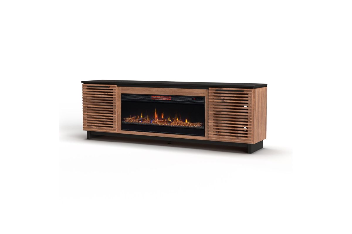 Bring home the Graceland 86" Electric Fireplace TV Stand from Bridgevine Home for a sophisticated and upscale addition to your living room or great room. This fireplace entertainment center is Scandinavian-inspired and artfully crafted from Poplar solids and Okume veneers with a two-tone Black and Bourbon finish. Featuring two doors, this TV stand will accommodate TVs up to 95 inches and provide ample storage for media and gaming consoles and home décor favorites. Cable management openings on the back panel will keep every cord and wire concealed. The 42" electric fireplace insert includes a remote control and multiple settings allow for heat up to 400 square feet. Four (included) screws make securing the fireplace insert to the console quick and simple. This showstopping fireplace TV Console will make a glamorous statement in your modern home. Minimal assembly required.