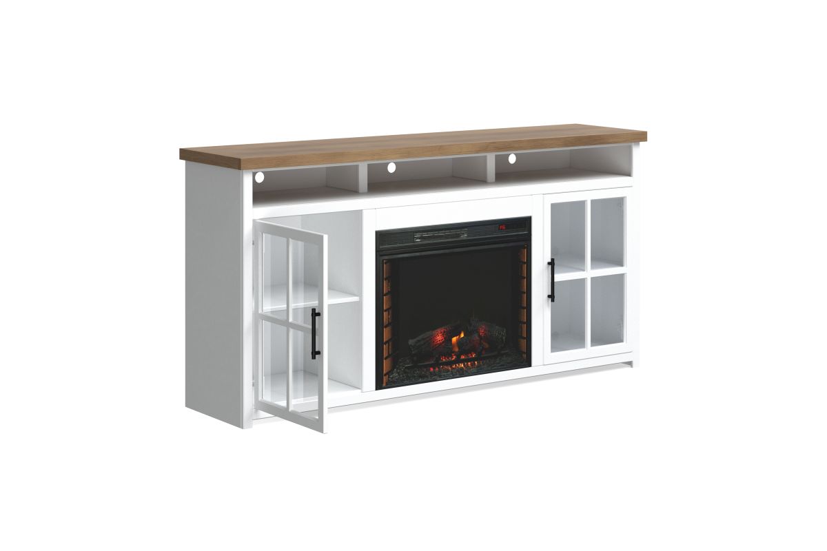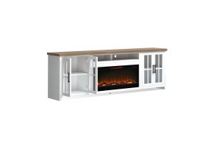 The Hampton 74" Fireplace TV Stand Console from Bridgevine Home delivers a flawless combination of modern farmhouse style and country simplicity. Beautifully crafted from Poplar Solids, Okoume Veneers and Knotty Alder, this Fireplace Entertainment Center features a two-tone Jasmine Whitewash and Barnwood finish and oil-rubbed Bronze hardware. Ideal for TVs up to 85 inches, this Fireplace TV Stand includes two glass windowpane doors, three shelves and cable management on the back panel for media and gaming console storage. The 28" electric fireplace insert includes a remote control and multiple settings allow for heat up to 400 square feet. Four (included) screws make securing the fireplace insert to the console quick and simple.