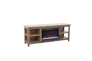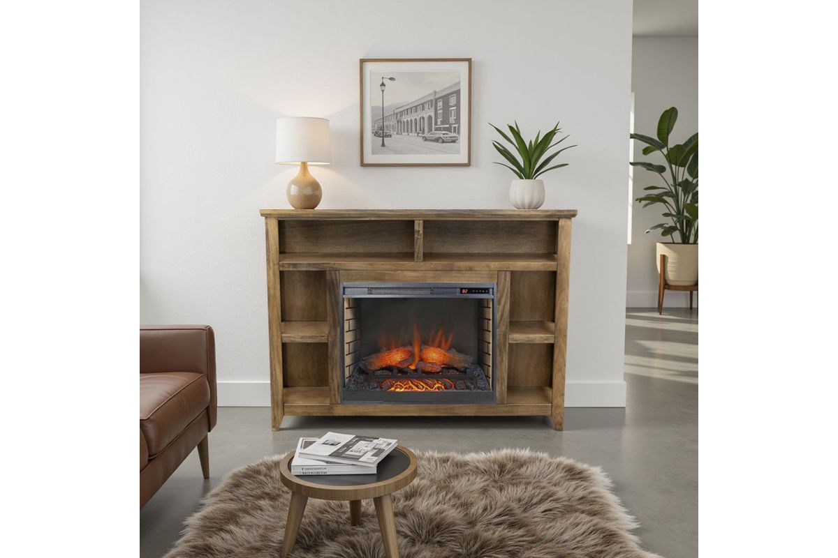 The Studio 56 inch Fireplace Mantel from Bridgevine Home delivers simple, transitional style and will make a versatile addition to any room in your home. Skillfully crafted from Poplar Solids and Okoume Veneers, this Electric Fireplace Mantel features a Bourbon finish and ample storage space on open shelving. The 42" electric fireplace insert includes a remote control and multiple settings allow for heat up to 400 square feet. Installation is quick and simply requires securing the fireplace insert to the mantel with four (included) screws. Set the mantel in place, plug in and get set to get cozy! Minimal assembly required.