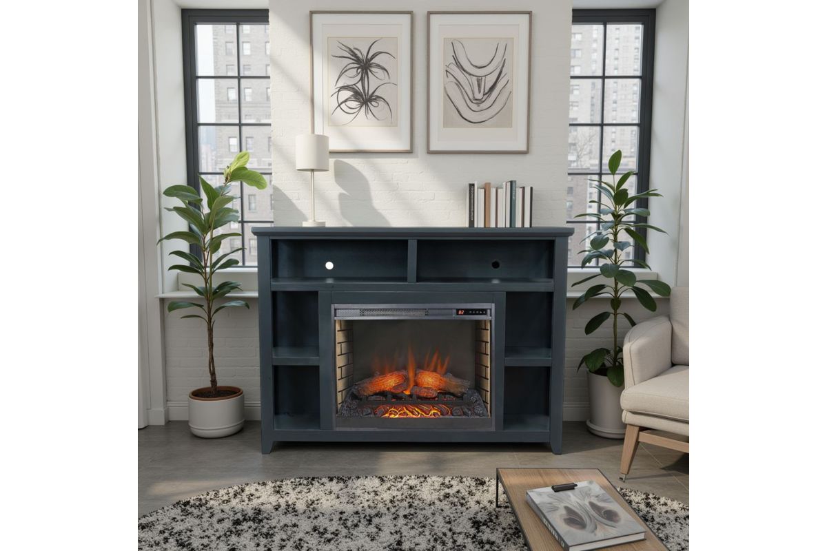 The Studio 56 inch Fireplace Mantel from Bridgevine Home delivers simple, transitional style and will make a versatile addition to any room in your home. Skillfully crafted from Poplar Solids and Okoume Veneers, this Electric Fireplace Mantel features a Black finish and ample storage space on open shelving. The 42" electric fireplace insert includes a remote control and multiple settings allow for heat up to 400 square feet. Installation is quick and simply requires securing the fireplace insert to the mantel with four (included) screws. Set the mantel in place, plug in and get set to get cozy! Minimal assembly required.