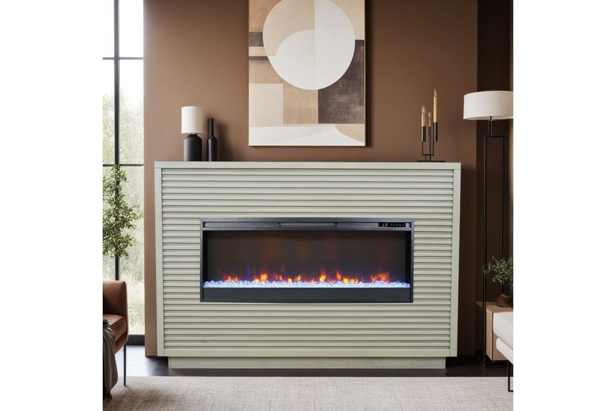 Bring home the Stardust 62 inch Fireplace Mantel from Bridgevine Home for a sophisticated and upscale addition to any room in your home. This sensational Electric Fireplace Mantel is artfully crafted from Poplar Solids and Okume Veneers and features a Sandstone finish and horizontal slat detailing. The 42" electric fireplace insert includes a remote control and multiple settings allow for heat up to 400 square feet. Installation is quick and simply requires securing the fireplace insert to the mantel with four (included) screws. Set the mantel in place, plug in and get set to get cozy! Minimal assembly required.