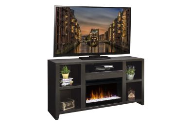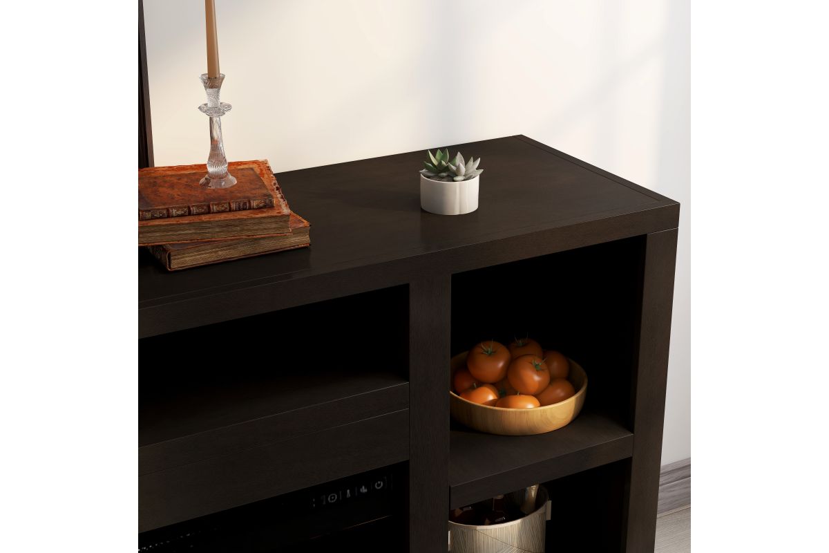 The Urban Loft 62" Electric Fireplace TV Stand Console from Bridgevine Home delivers form and function with an upscale urban feel. Crafted from Poplar Solids and premium Veneers in a rich Mocha brown finish, this fireplace entertainment center will accommodate TVs up to 70 inches and provide ample storage for media and gaming consoles on the open shelving. Cable management openings on the back panel will keep your cords and wires concealed. The 26" electric fireplace insert includes a remote control and multiple settings allow for heat up to 400 square feet. Four (included) screws make securing the fireplace insert to the console quick and simple. Minimal assembly required.