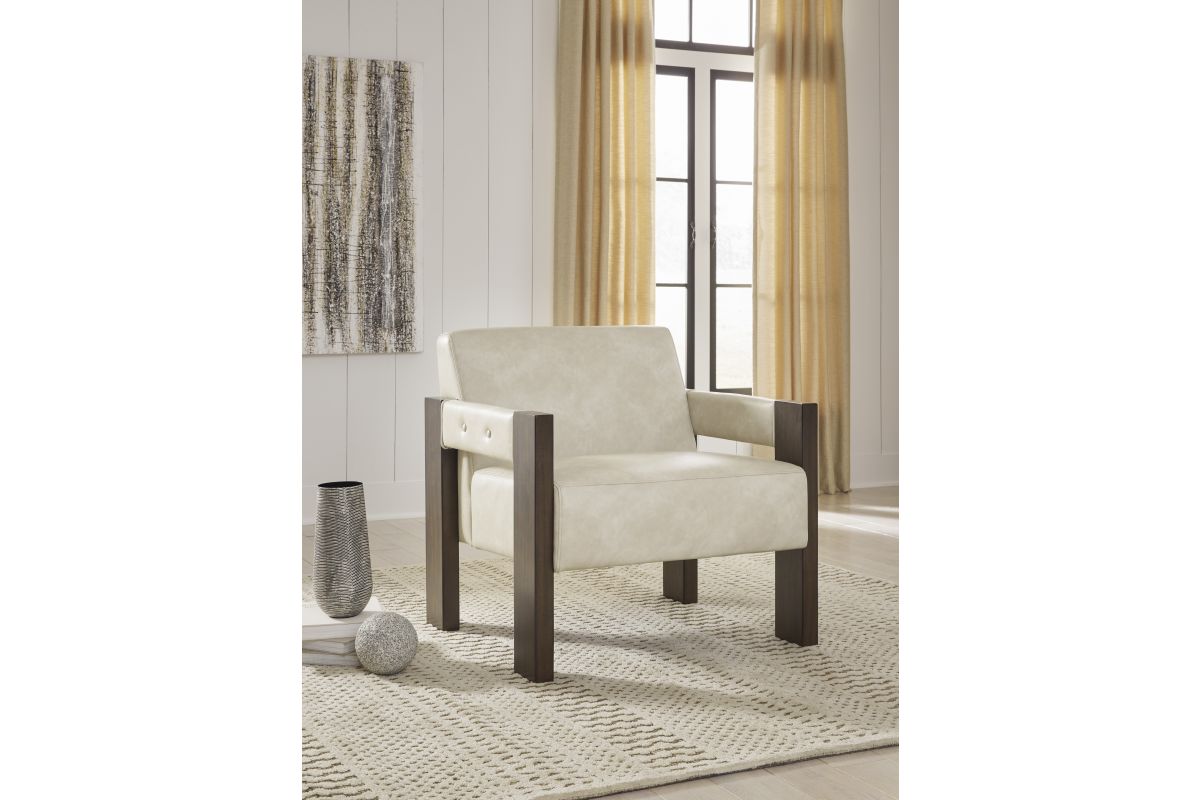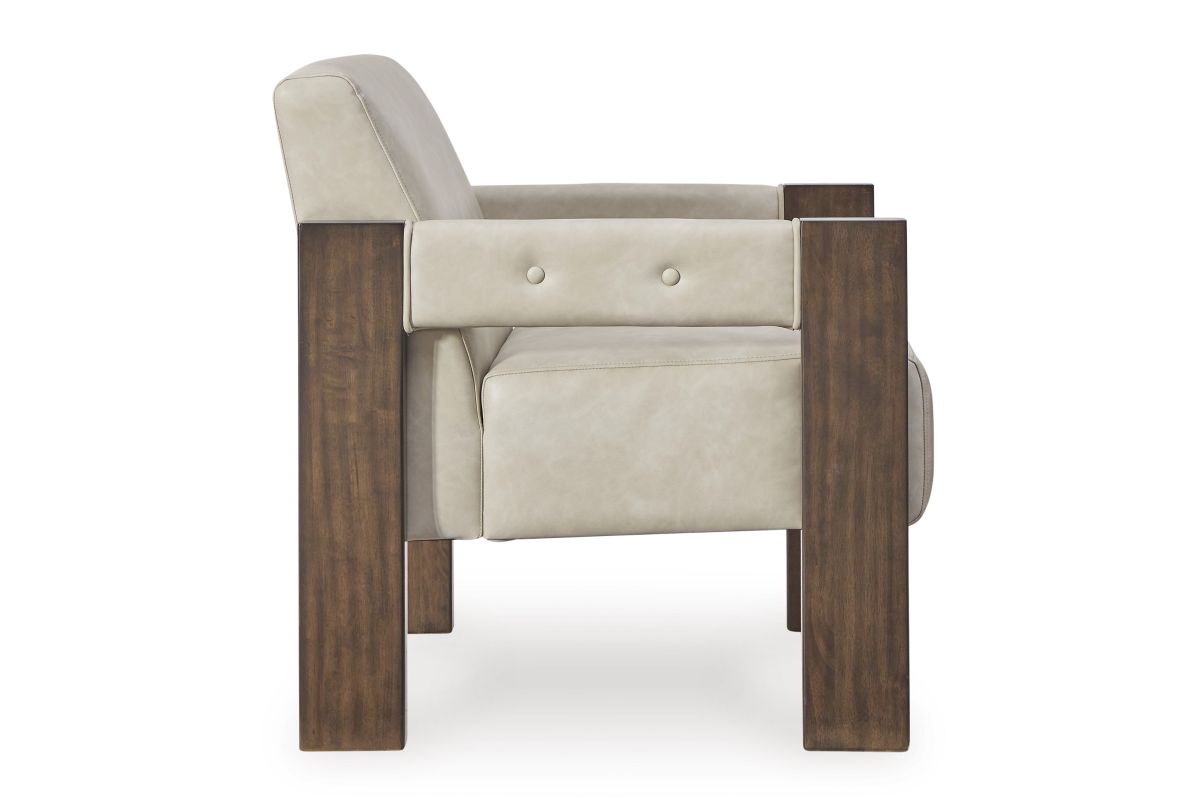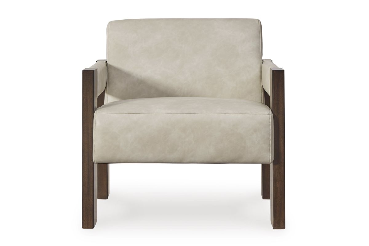 This accent chair is an ultra-contemporary addition to your seating area. Warm espresso-hued wood and neutral faux leather harmonize beautifully for a luxuriously welcoming vibe. Whether you're cozying up with coffee or settling in to stream your favorite show, relaxing has never been so comfortably chic. Assembly required.