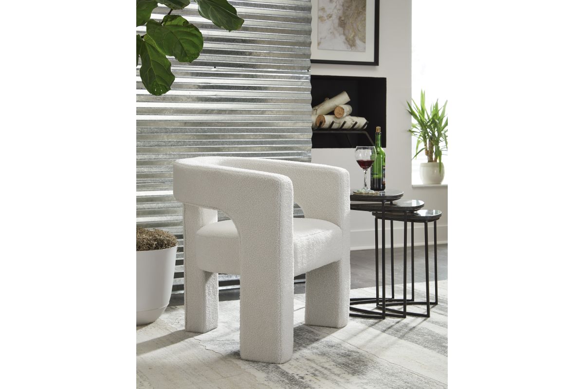 With its sculptural silhouette and barrel-back design, this accent chair exudes runway-inspired style. Peek-a-boo styling and decadent boucle upholstery combine both fashion and comfort seamlessly. Who says cutouts are just for your wardrobe? No assembly required.