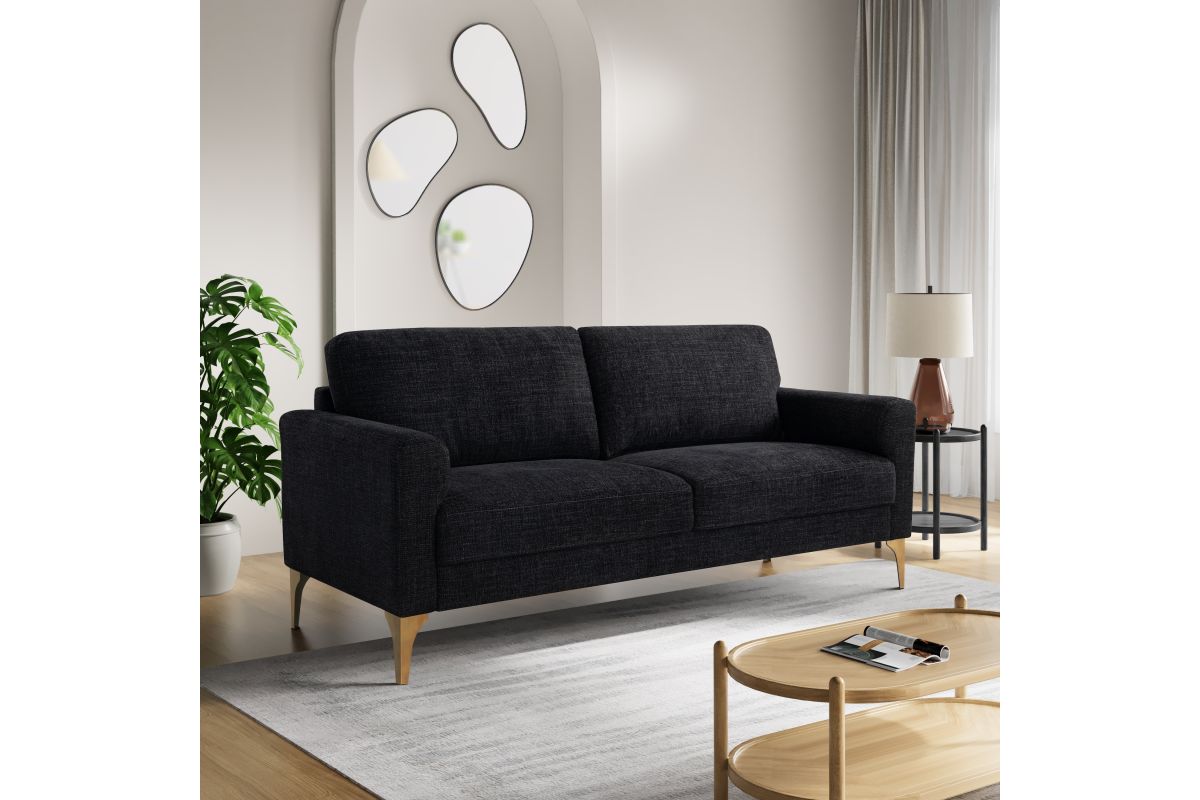 The Miley Sofa is the ideal combination of contemporary design and lasting comfort. Upholstered in premium woven fabric, it offers a sophisticated look that complements any décor. Built on a solid hardwood frame, this sofa is crafted for long-term durability, while its metal legs add a modern touch and ensure sturdy support. The removable back cushions allow for easy cleaning and customizable comfort. High-density foam in the seat cushions provides a plush yet supportive feel, perfect for lounging or entertaining. Whether you're relaxing solo or hosting guests, the Miley Sofa offers both style and functionality. Asembly is required upon delivery.
