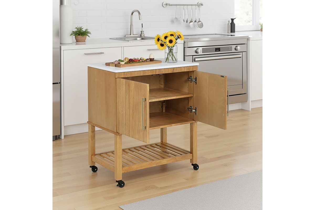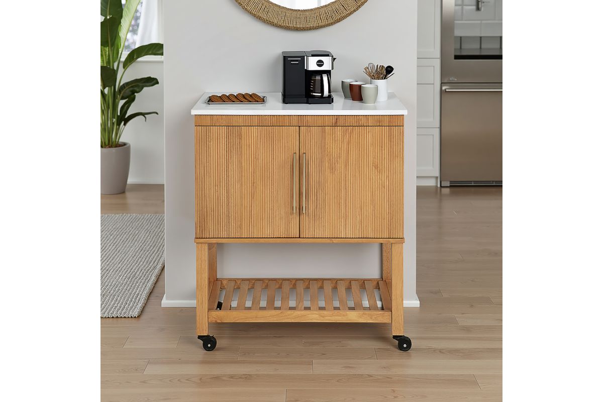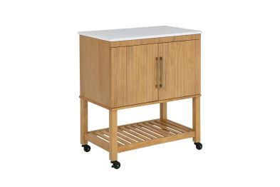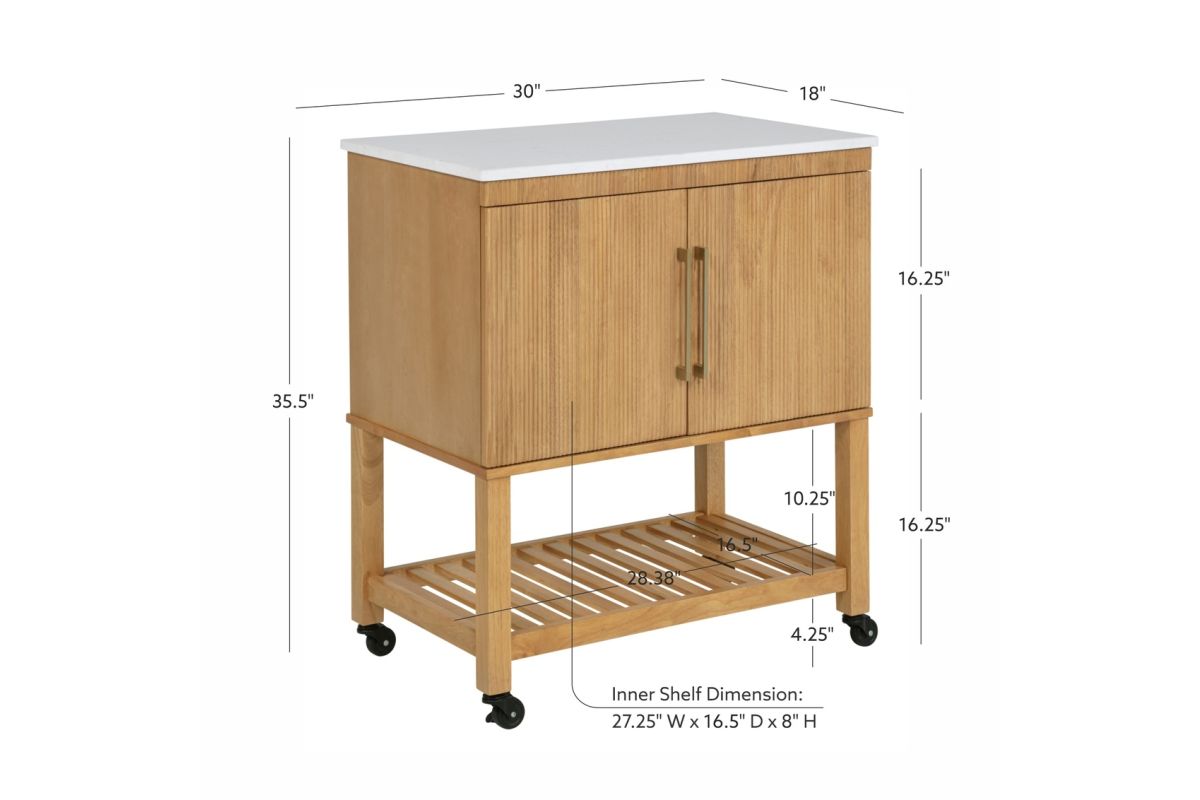 Bring warmth and functionality to your kitchen with this gorgeous natural kitchen cart. Constructed from a durable blend of rubberwood and engineered wood with a birch veneer, it showcases a natural lacquer finish that highlights its organic beauty. The white granite stone top offers a robust and stylish workspace with a 100lb weight capacity, perfect for food preparation or display. Gold-plated steel handles add a touch of elegance, while the front's reeded texture introduces a unique design element. With a spacious interior featuring a shelf and bottom shelf, plus a lower slatted shelf for open storage, this cart effortlessly blends rustic charm with practical utility, making it an ideal fit for any home. Please note: Use a cutting board or other food-safe surface when preparing meals on the countertop for food safety. Assembly required.