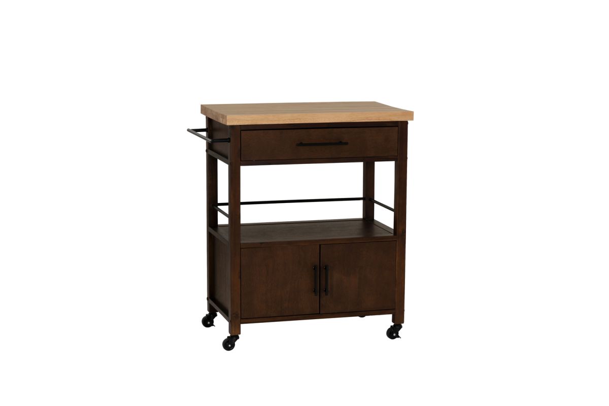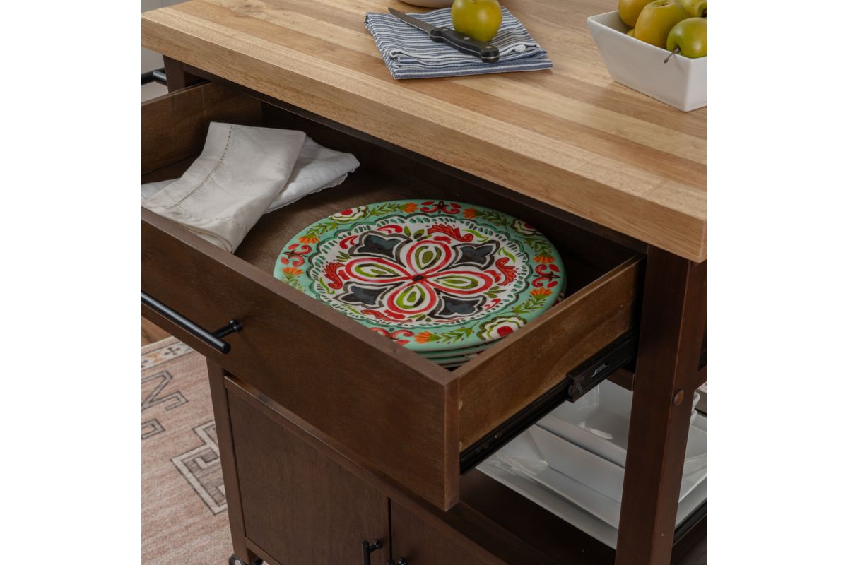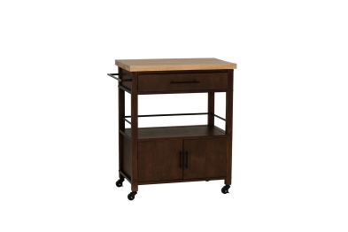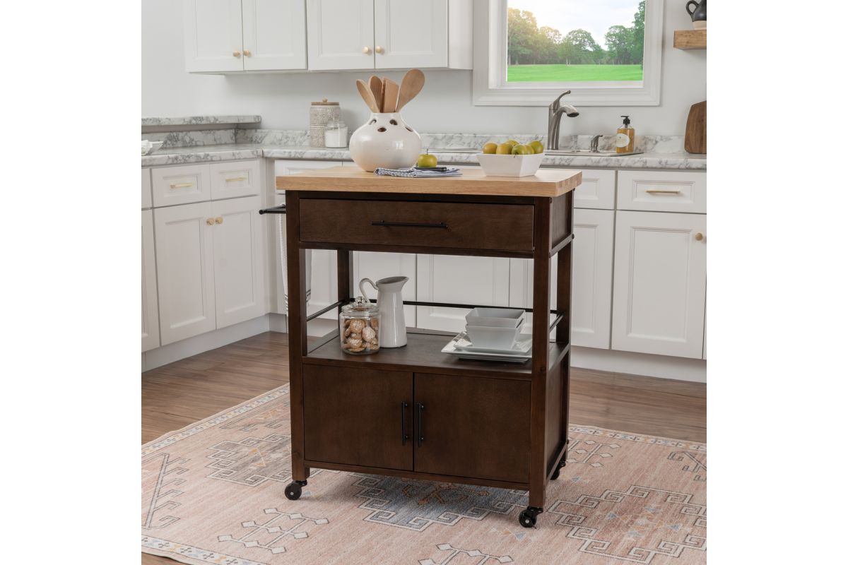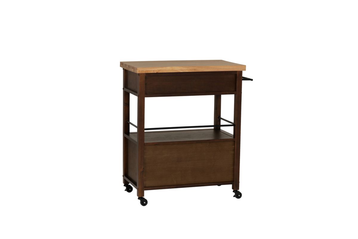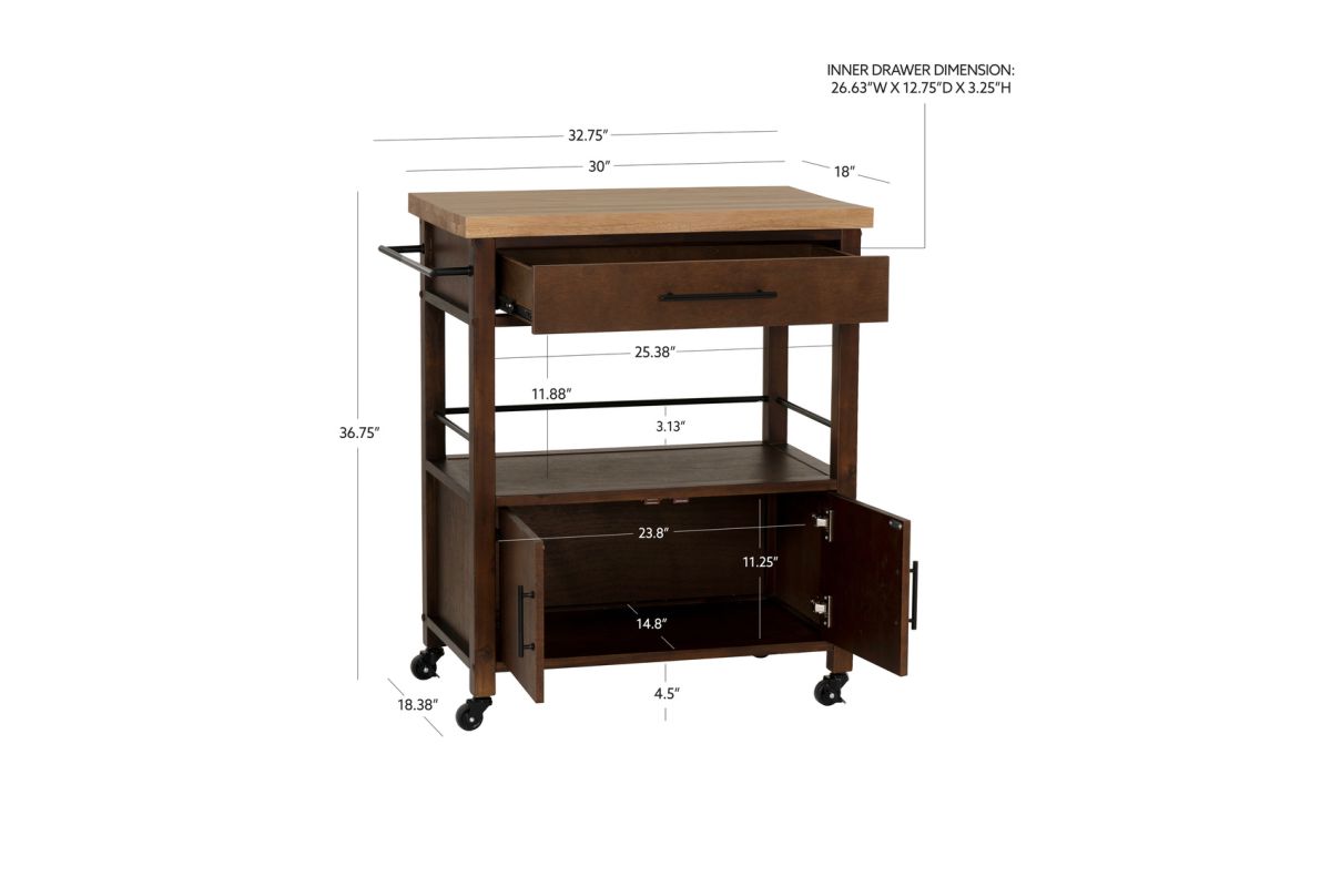 Enhance your kitchen’s charm and utility with this elegant kitchen cart, thoughtfully designed for style and practicality. Constructed from a blend of durable rubberwood, acacia, and MDF with an Okoume veneer, this cart is built to last while showcasing a stunning dark walnut lacquer that exudes timeless sophistication. The top drawer offers convenient storage for utensils and small essentials, while the open middle shelf provides easy access to frequently used items or decorative pieces. A spacious bottom shelf lies behind the two cabinet doors, perfect for stowing larger cookware, pantry items, or small appliances. The sleek black powder-coated hardware, including the drawer handle, cabinet handles, and towel rack, adds a bold, modern contrast to the warm wood tones. Designed with mobility in mind, this cart features two 360° swivel casters for effortless movement and two locking casters to keep it securely in place. Whether used for meal prep, storage, or serving, this versatile cart blends functionality and style, making it a must-have addition to your kitchen. Assembly required.