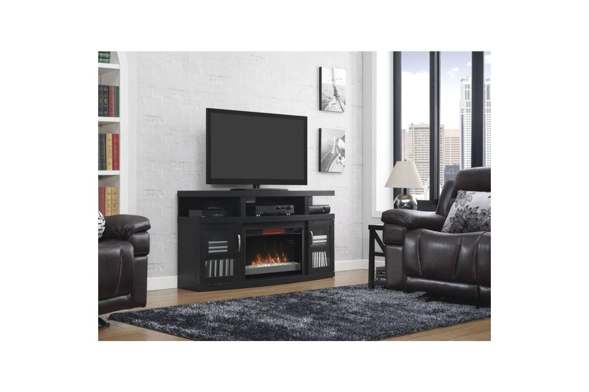 The Cantilever Electric Fireplace features partitioned, open center shelves for electronic media components with integrated wire management for easy use. There are left and right side storage cabinets with adjustable wood shelves for ample storage.