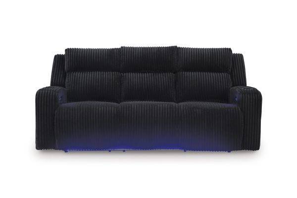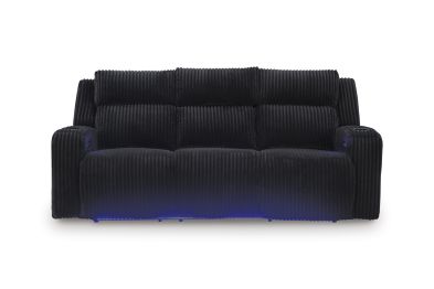 Trend-right style, meet irresistible modern function. Your living room gets a cozy-cool upgrade with this power reclining sofa. Curl up in its ultra-chic corded upholstery and recline with one-touch controls. Is it movie night or game time? With ambient LED lighting and wireless audio connectivity, this sofa transforms from a serene relaxation spot to an entertainment hub. Its drop-down table, USB charging and cup holders make lounging all the more convenient. No assembly required.