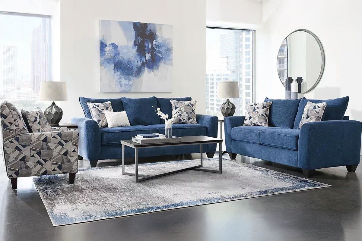 The Capri Collection blends cozy comfort with contemporary style, making it a perfect fit for modern living rooms. Upholstered in soft chenille fabric and available in your choice of navy or grey, each piece offers a versatile look that pairs easily with a variety of décors. The collection includes a sofa, loveseat, and chair, all designed with plush cushions, gently flared arms, and a tailored silhouette that keeps your space looking fresh and inviting.