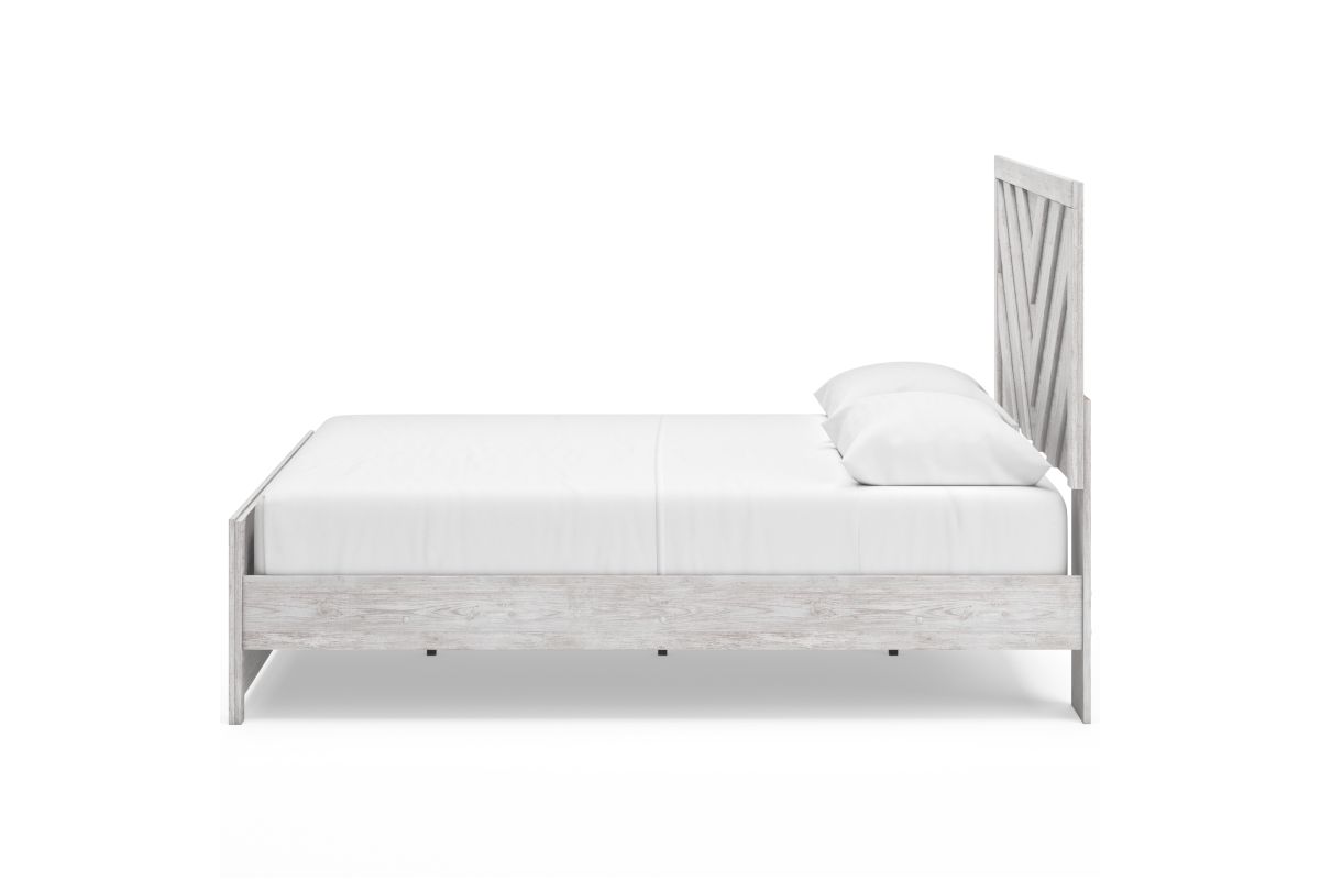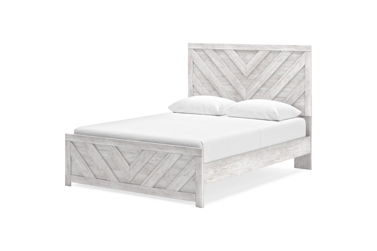 Charmingly designed, this queen panel bed embraces the aesthetics of countryside living and repurposes them for modern settings. Its whitewash paint, replicating the wear and tear of time, appeals to your love of vintage character. And a chic chevron pattern on the headboard and footboard keeps your bedroom effortlessly on trend. Assembly required.