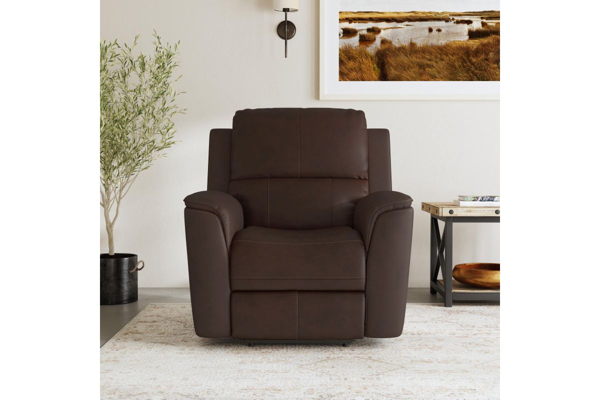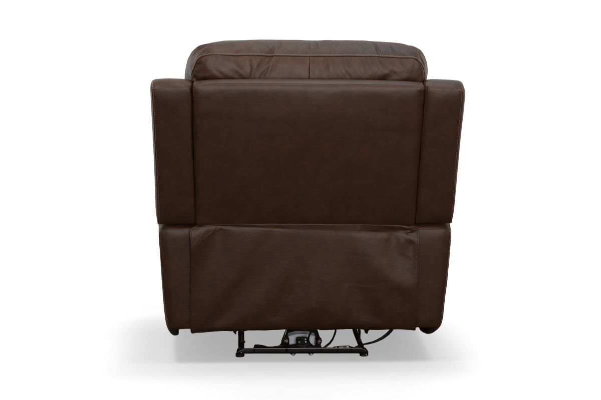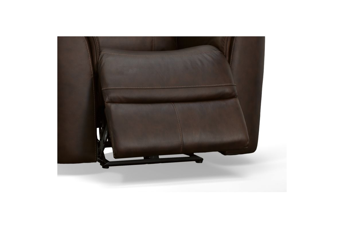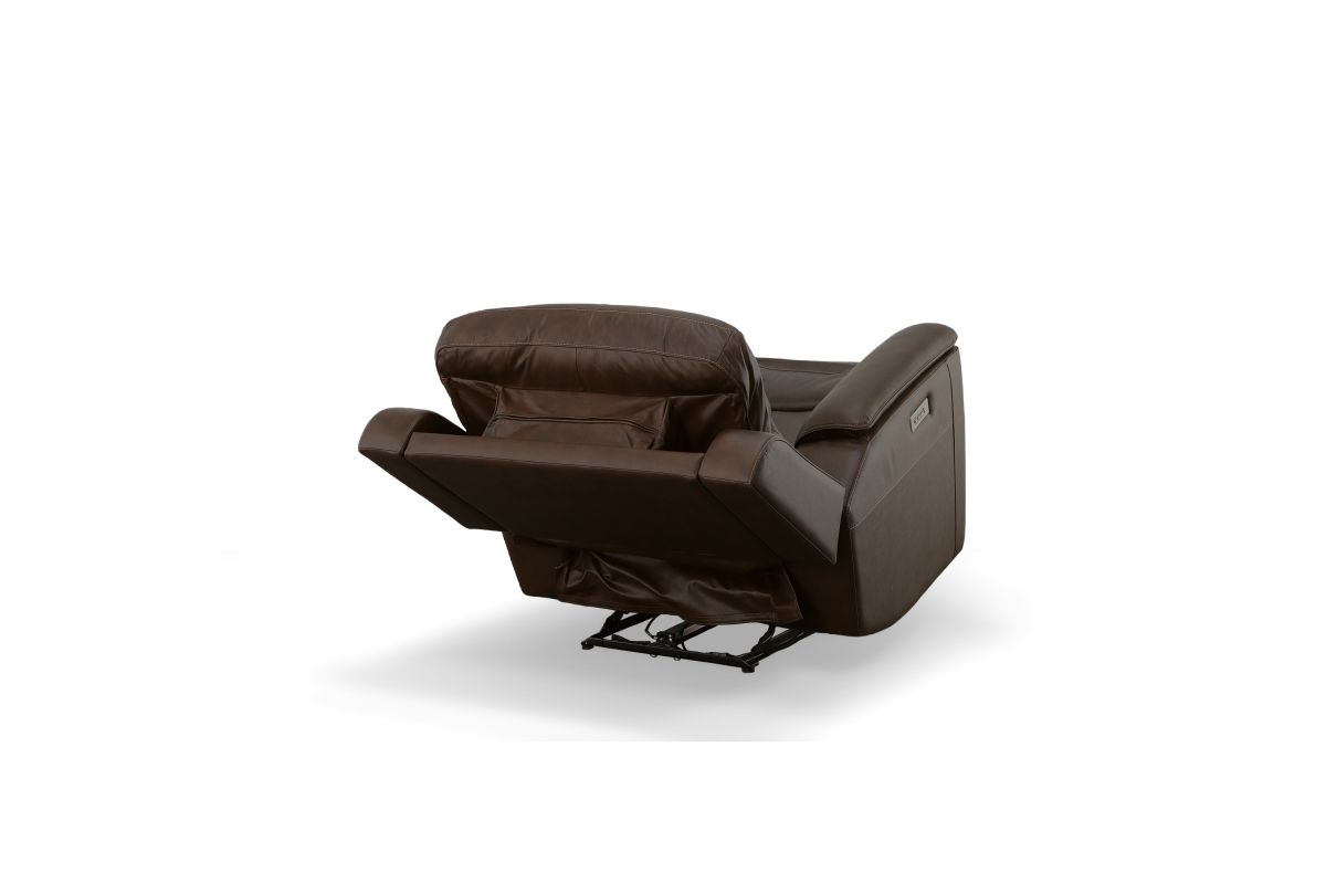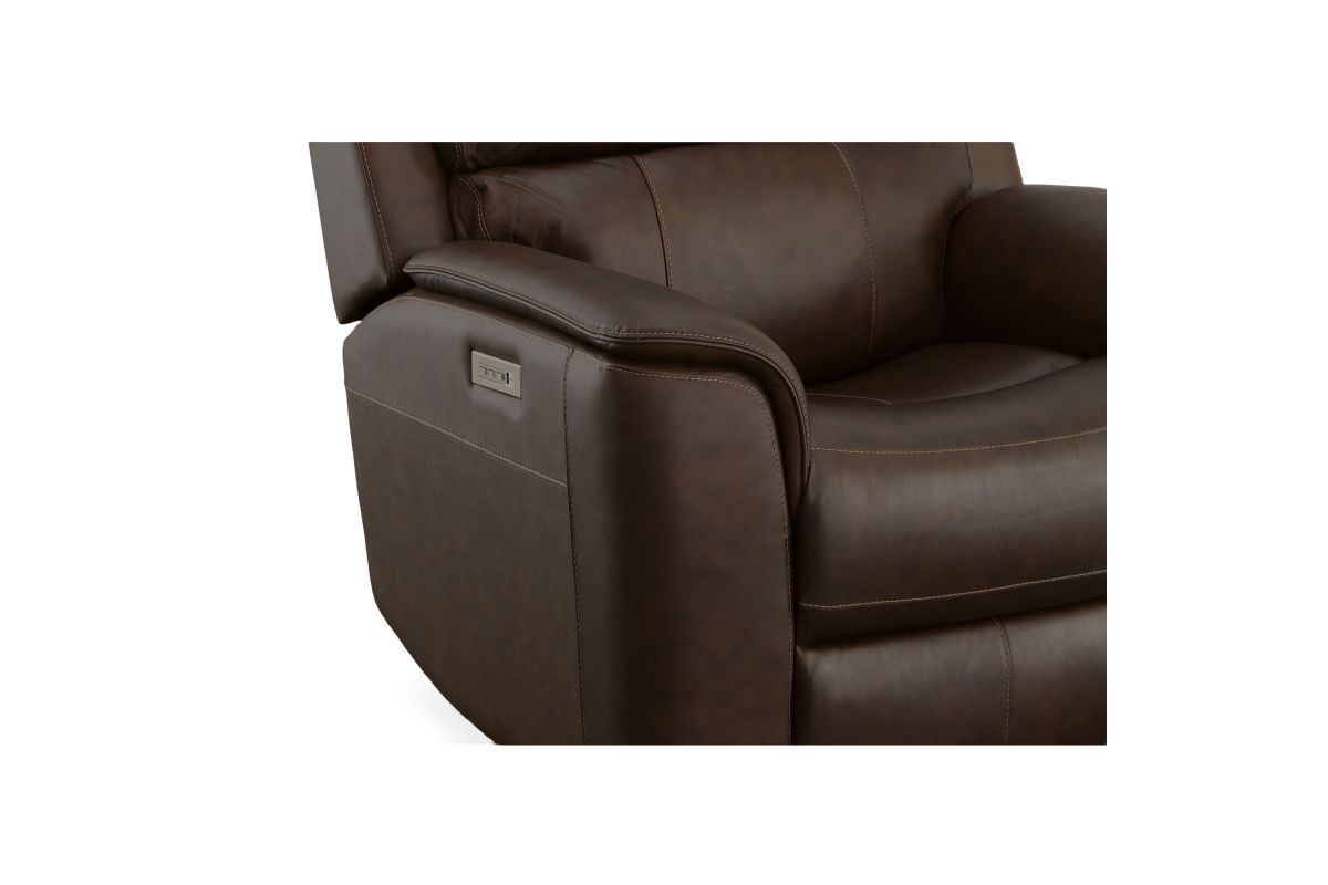 Treat yourself to a comfortable yet refined sitting experience with the Oliver leather power swivel recliner with power headrest and lumbar. This generously scaled frame is upholstered in a durable, sumptuous leather, and features a contoured seat and padded arms with a unique sculptural shape and welt trim. Power recline, headrest and lumbar control on the right side allows for customized comfort, and an included USB port provides convenient device charging. The Zero Gravity recline technology gives the feeling of weightlessness while Flexsteel's patented Blue Steel Spring™ provides lasting seat support.