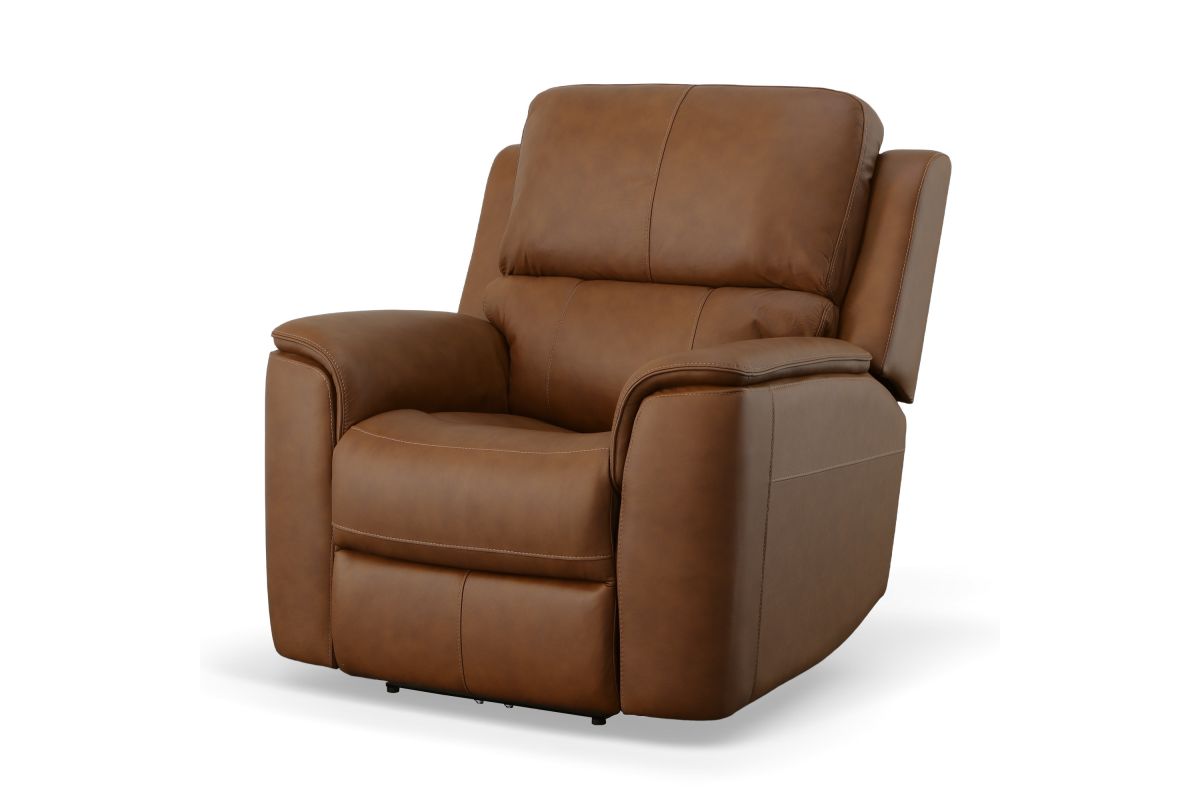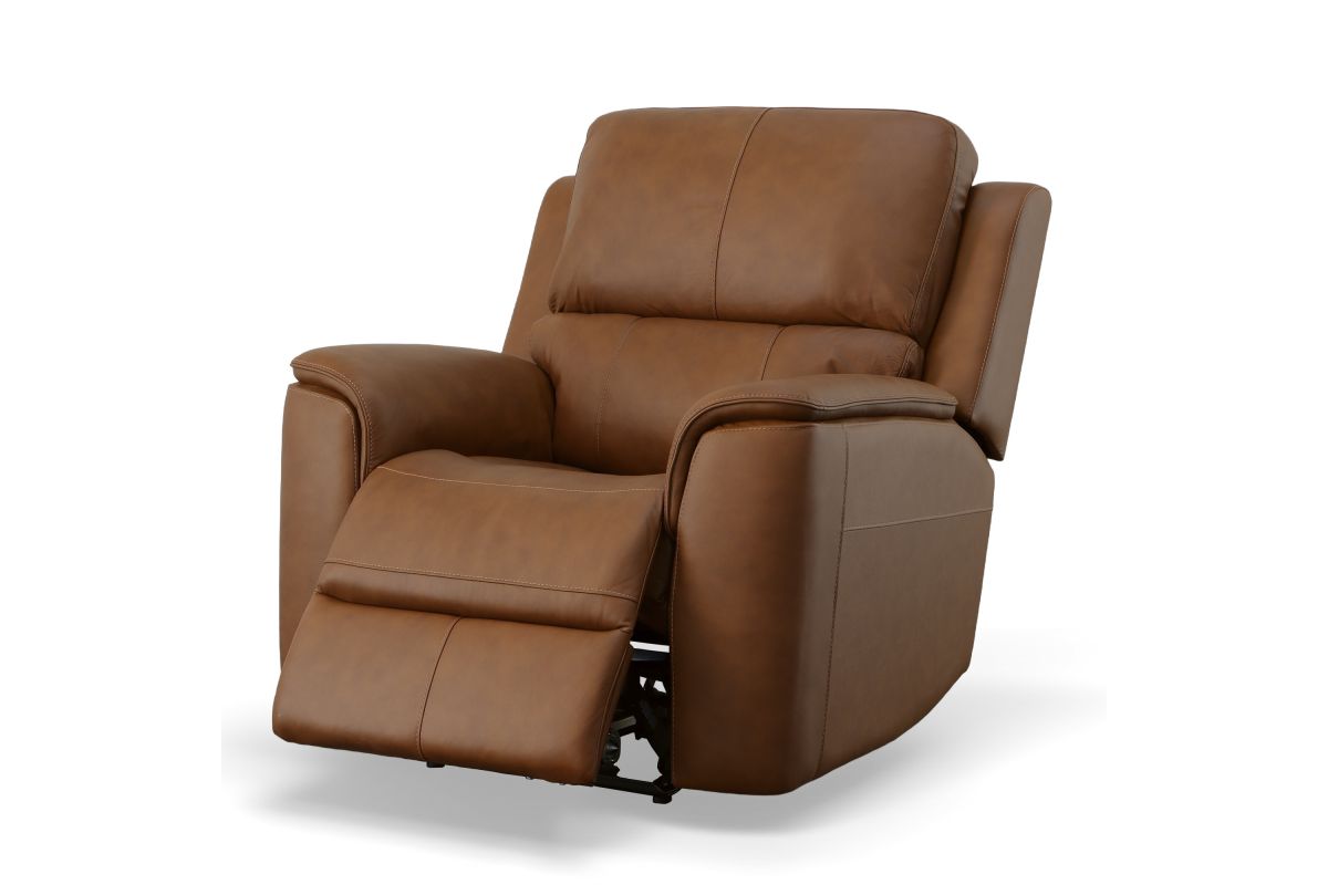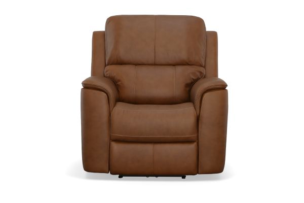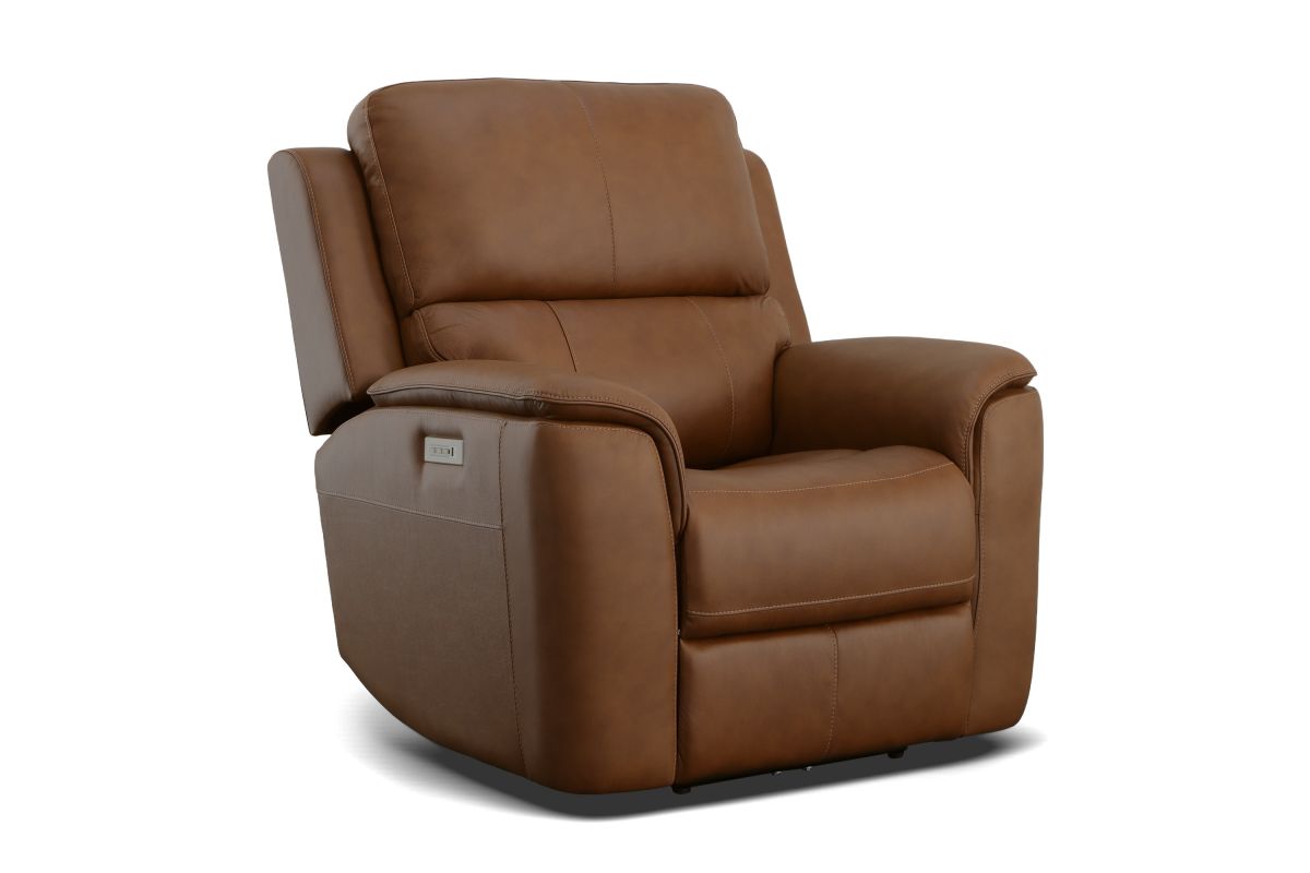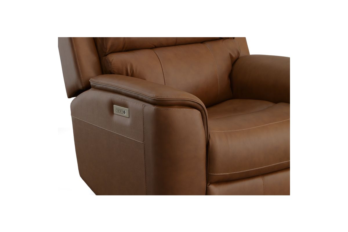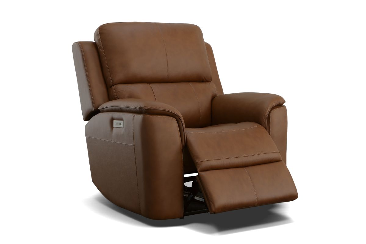 Treat yourself to a comfortable yet refined sitting experience with the Oliver leather power swivel recliner with power headrest and lumbar. This generously scaled frame is upholstered in a durable, sumptuous leather, and features a contoured seat and padded arms with a unique sculptural shape and welt trim. Power recline, headrest and lumbar control on the right side allows for customized comfort, and an included USB port provides convenient device charging. The Zero Gravity recline technology gives the feeling of weightlessness while Flexsteel's patented Blue Steel Spring™ provides lasting seat support.