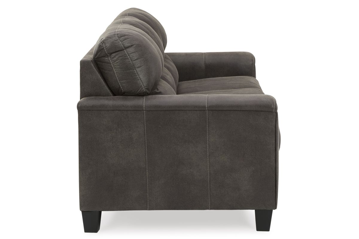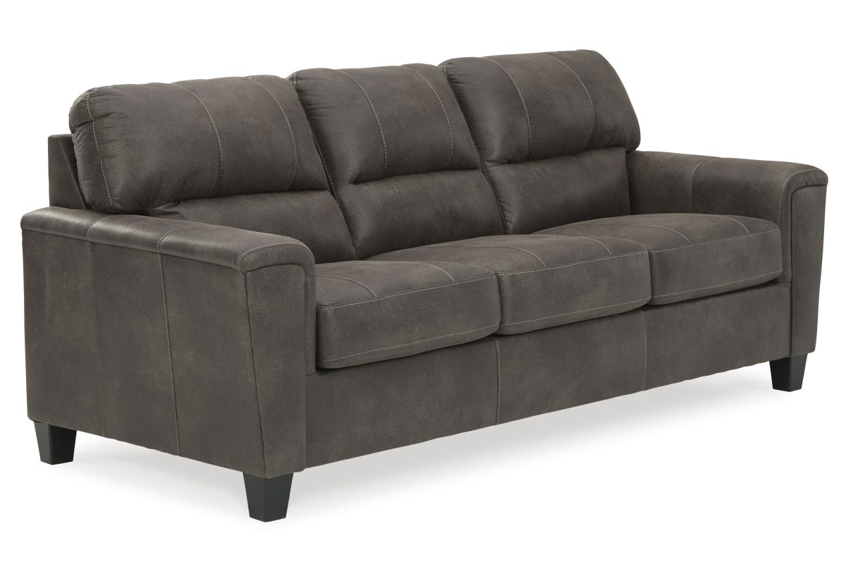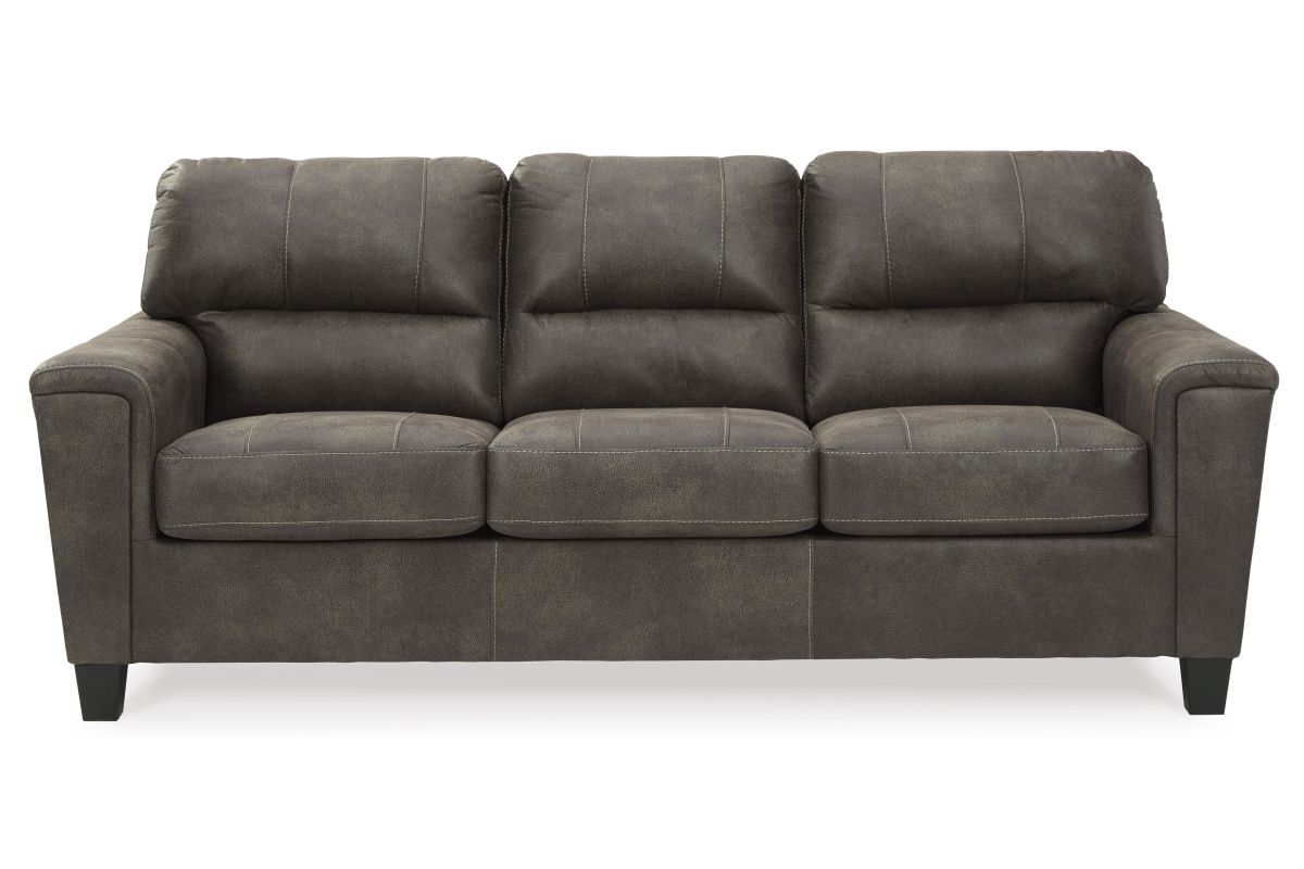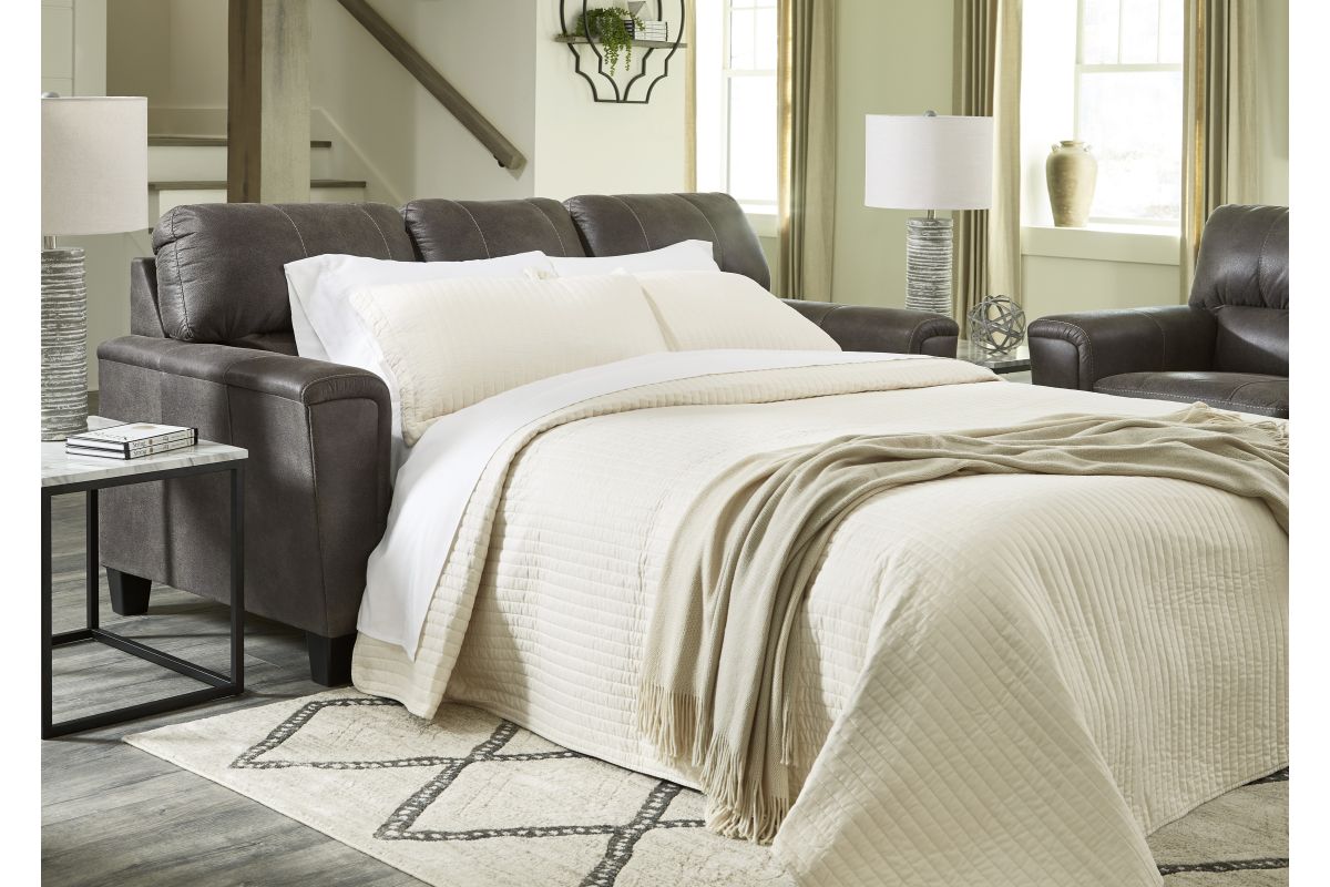 If you love the cool look of leather but long for the warm feel of fabric, you can take comfort in this queen sofa sleeper. Wrapped in a fabulous faux leather with a weathered hue and hint of pebbly texture to resemble the real deal, this decidedly modern sofa proves less is more. Elements include angled side profiling and track armrests wrapped with a layer of pillowy softness for that little something extra. Prominent jumbo stitching and clean-lined divided back styling lend fashion-forward flair. Rest assured, the queen memory foam mattress comfortably accommodates overnight guests. Assembly required.