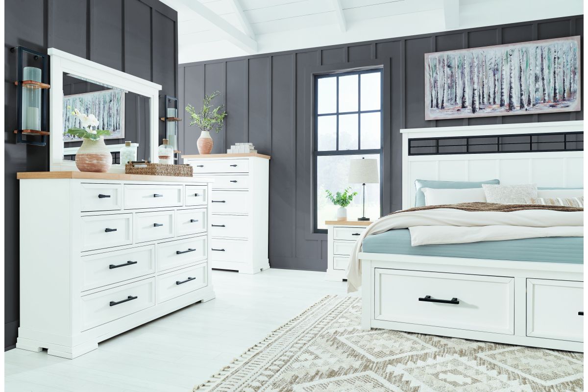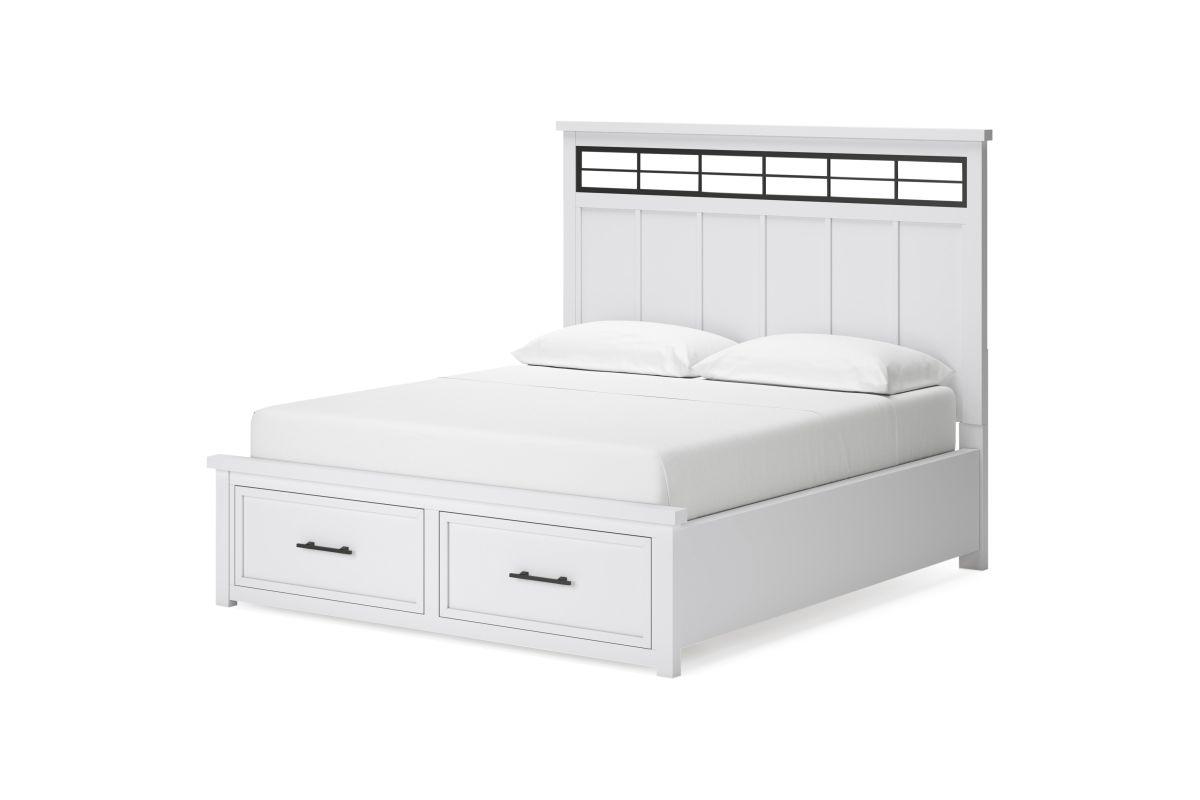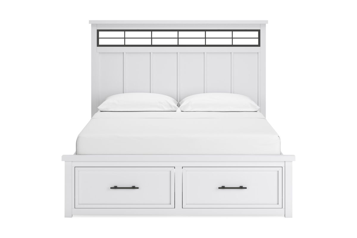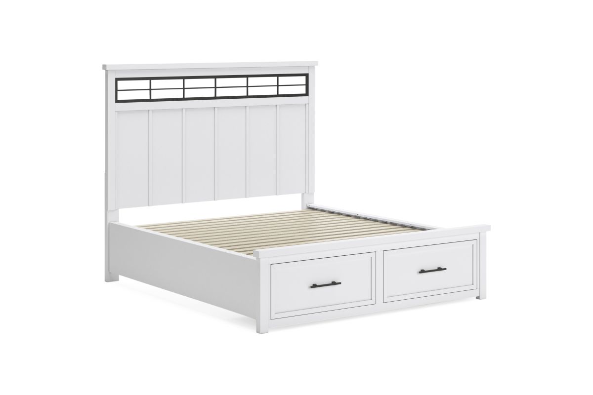 This California king panel storage bed delivers casual style with substance. An inset metal detail on the headboard displays a unique take on modern farmhouse design. The bed's sturdy silhouette, classic white finish and black pulls exude a comfortably cozy vibe in your soothing sanctuary. Storage drawers are spacious enough for all your essentials. Assembly required.