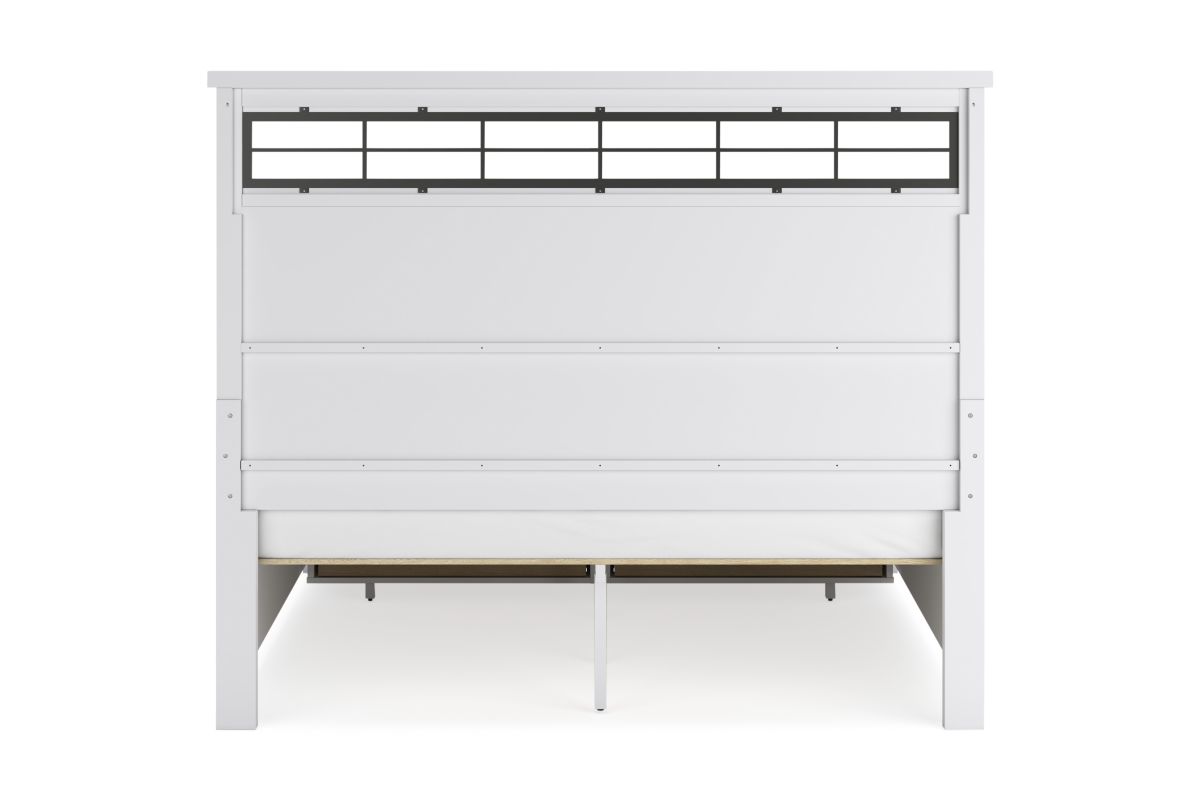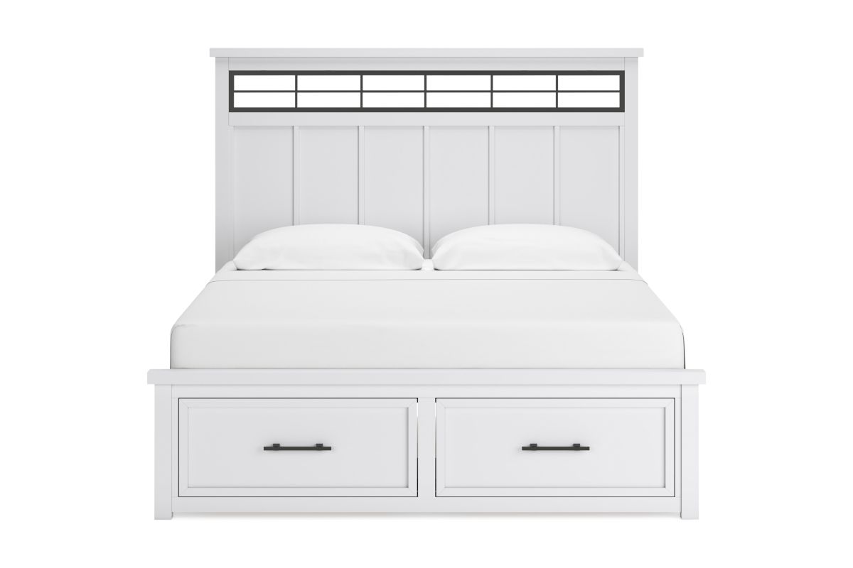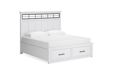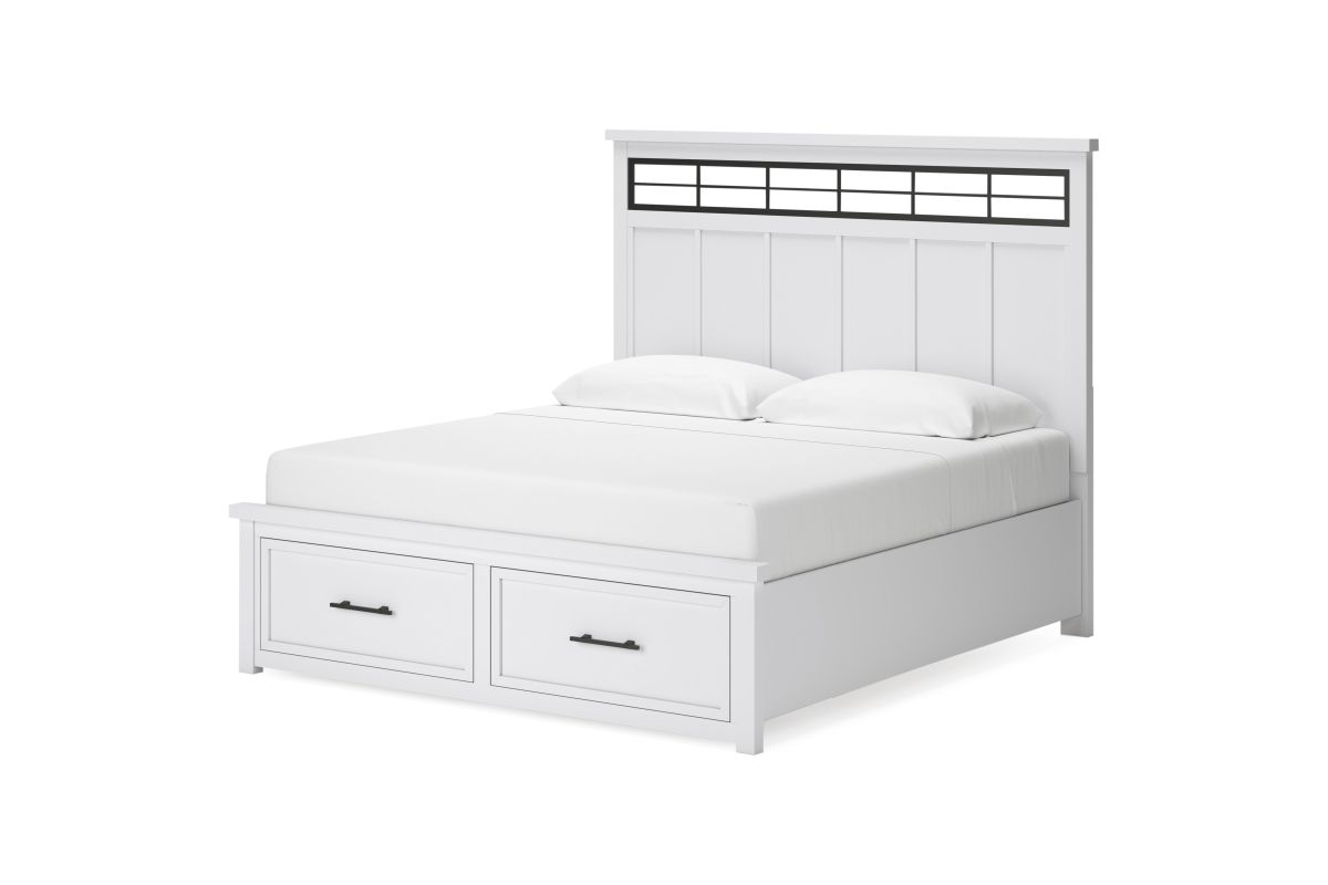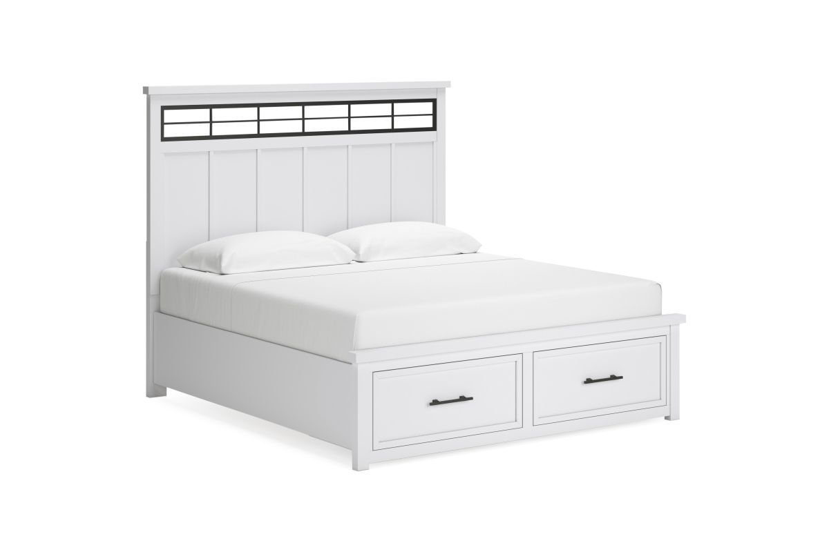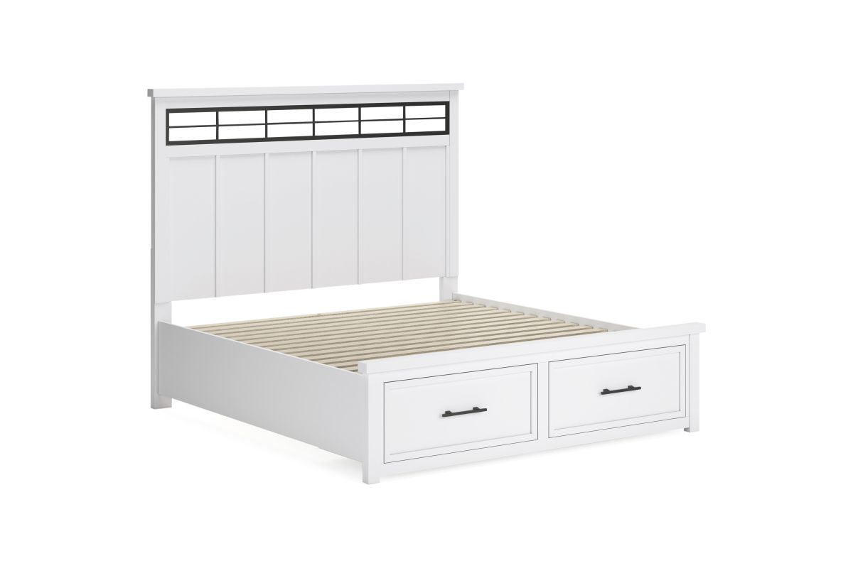 This king panel storage bed delivers casual style with substance. An inset metal detail on the headboard displays a unique take on modern farmhouse design. The bed's sturdy silhouette, classic white finish and black pulls exude a comfortably cozy vibe in your soothing sanctuary. Storage drawers are spacious enough for all your essentials. Assembly required.