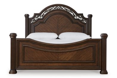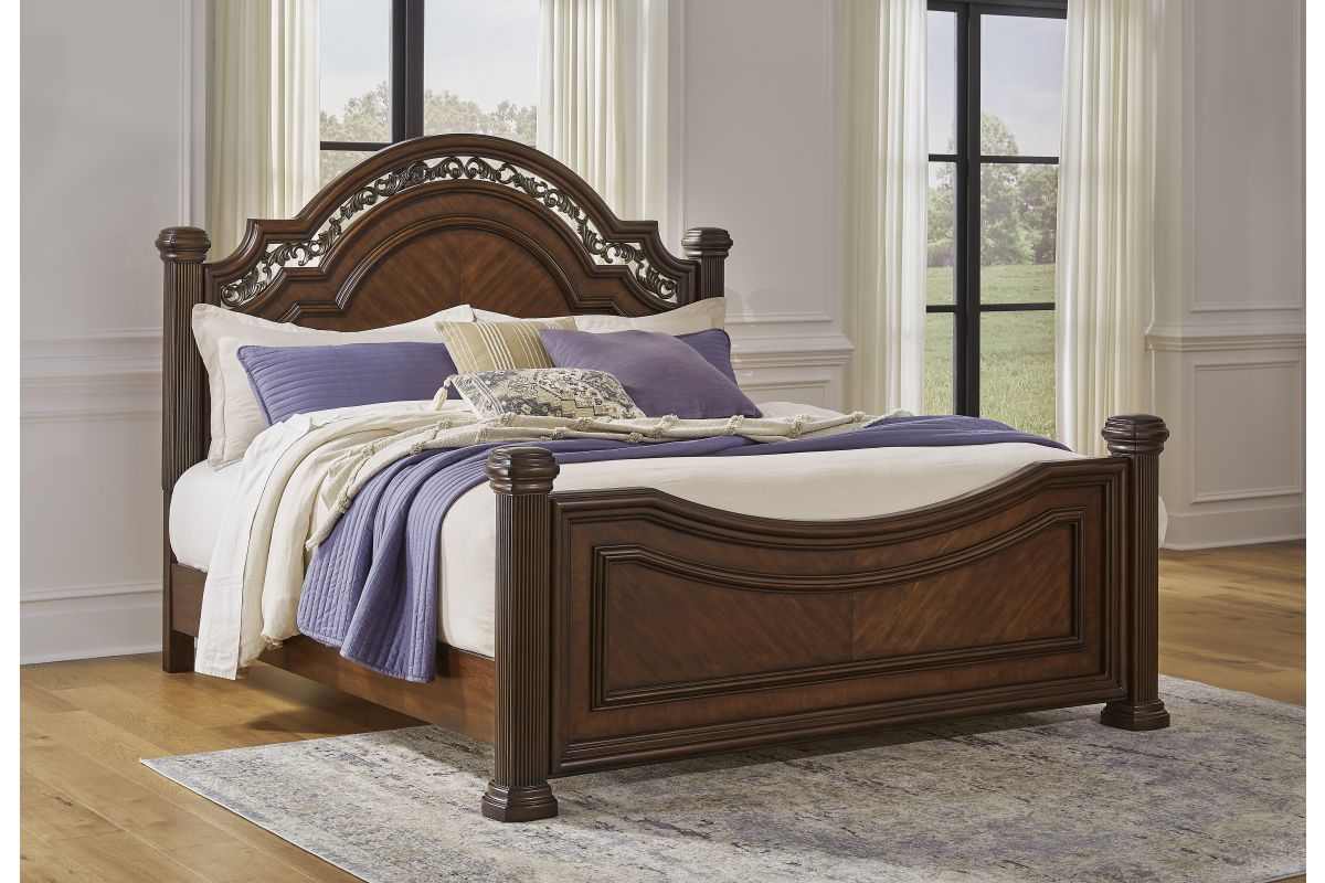 Take inspiration from the traditional luxury of this California king poster bed. Classic with a rich cherry brown finish, its stately presence graces your room with an air of opulence. Your taste for exquisite details is satisfied with the headboard's ornate accent filigree. With an elegantly crafted footboard completing the look, your restful retreat has never been so refined. Assembly required.