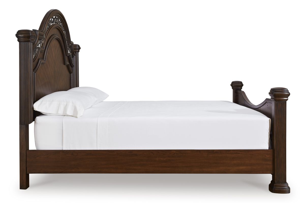 Take inspiration from the traditional luxury of this king poster bed. Classic with a rich cherry brown finish, its stately presence graces your room with an air of opulence. Your taste for exquisite details is satisfied with the headboard's ornate accent filigree. With an elegantly crafted footboard completing the look, your restful retreat has never been so refined. Assembly required.