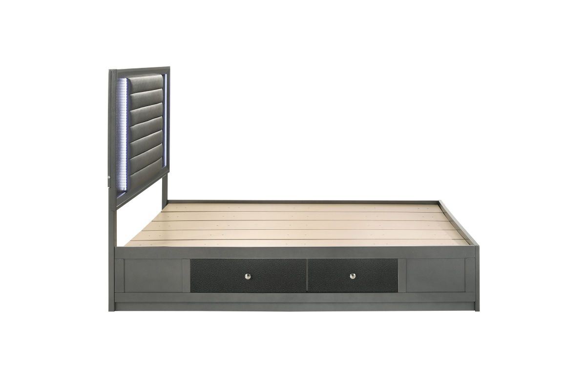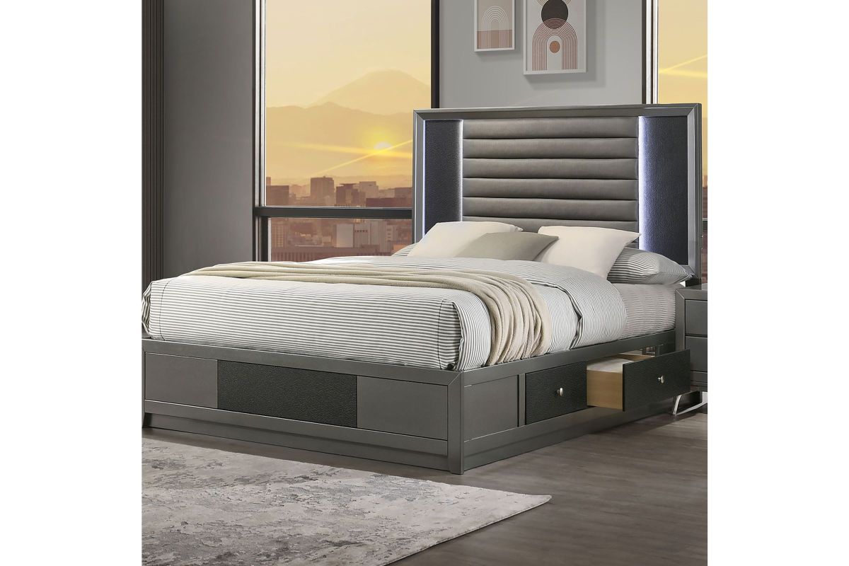 Discover the Nocturne Bed, a fusion of robust construction and chic design that promises both style and functionality. Crafted with the resilience of Rubberwood and the finesse of Okoume veneers, this bed is built to last. The slate gray finish, with its subtle sheen, harmonizes with textured charcoal panels for a sophisticated color palette. The headboard, a statement of subtle glam, boasts a backlit, rolled upholstery panel, offering an inviting space for relaxation. The bed's design is mindful of space, incorporating four underbed drawers to maximize storage efficiency. Its contemporary aesthetic, highlighted by silver legs and ambient lighting, creates a modern sanctuary in any bedroom. This bed is not just a piece of furniture; it's a lifestyle upgrade for those who appreciate a blend of comfort and elegance. Assembly required.