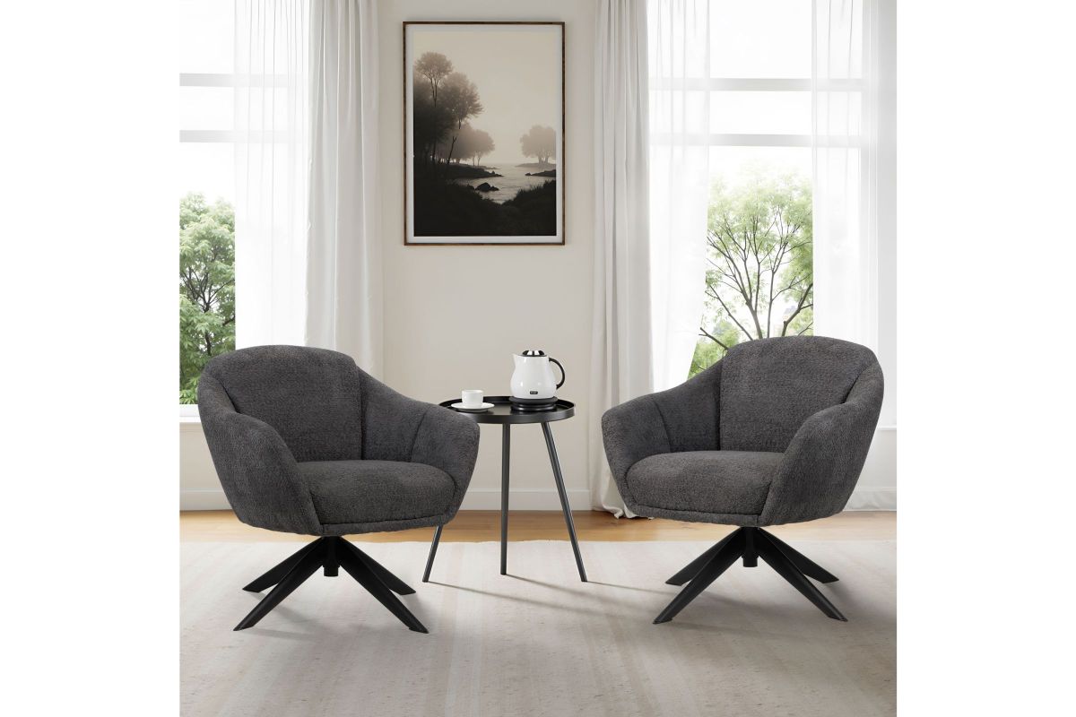 The Fleming Gray Boucle Swivel Lounge Chairs offer the perfect blend of comfort and functionality, making it an ideal choice for relaxed gatherings. With its gently curved silhouette and generous padding, this chair provides plush seating in an inviting design. The 100% polyester boucle fabric delivers a cozy, tactile experience, while being easy to maintain for everyday practicality. The black iron swivel base offers smooth, reliable 360° motion and adds a sleek contrast to the soft light gray fabric. This lounge chairs combine modern style, comfort, and durability, making it a versatile addition to any space. Assembly required.
