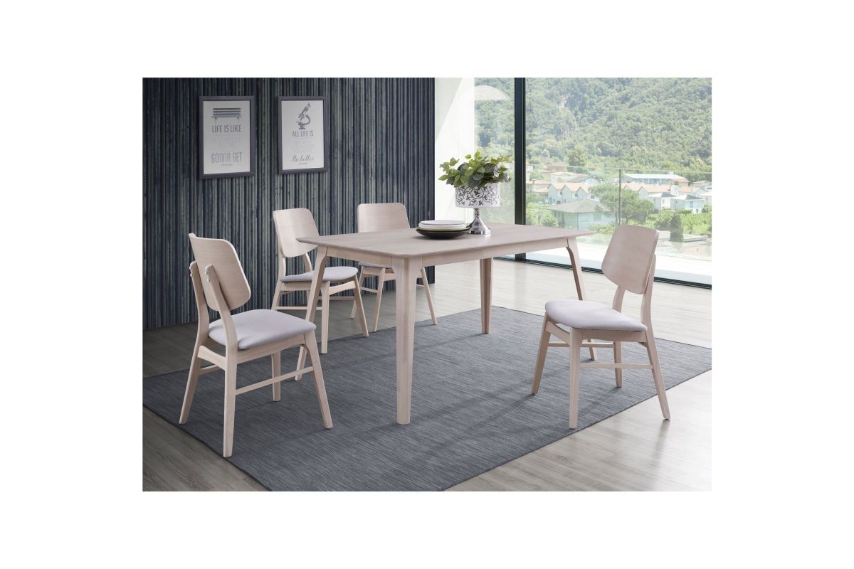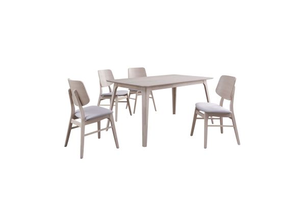 The Oscar Mid-Century Modern Wood 5 Piece Dining Set embodies the essence of mid-century modern design, characterized by clean lines, organic curves, and a focus on functionality. The sleek, minimalist design of the 60-inch dining table and accompanying 4 chairs reflects the timeless appeal of this iconic style, making it a versatile addition to any dining space. The White Ash finish and natural grain patterns add warmth and sophistication, while the subtle curves and tapered legs provide a touch of elegance. This set not only enhances your dining area aesthetically but also offers practical features such as reinforcing base stretchers for the chairs and a sturdy table that seats up to six people comfortably. With its blend of quality craftsmanship and classic design, the Oscar Dining Collection is a standout choice for those who appreciate both style and substance in their home furnishings. Assembly required. What's Included: (1) Dining Table, (4) Chairs